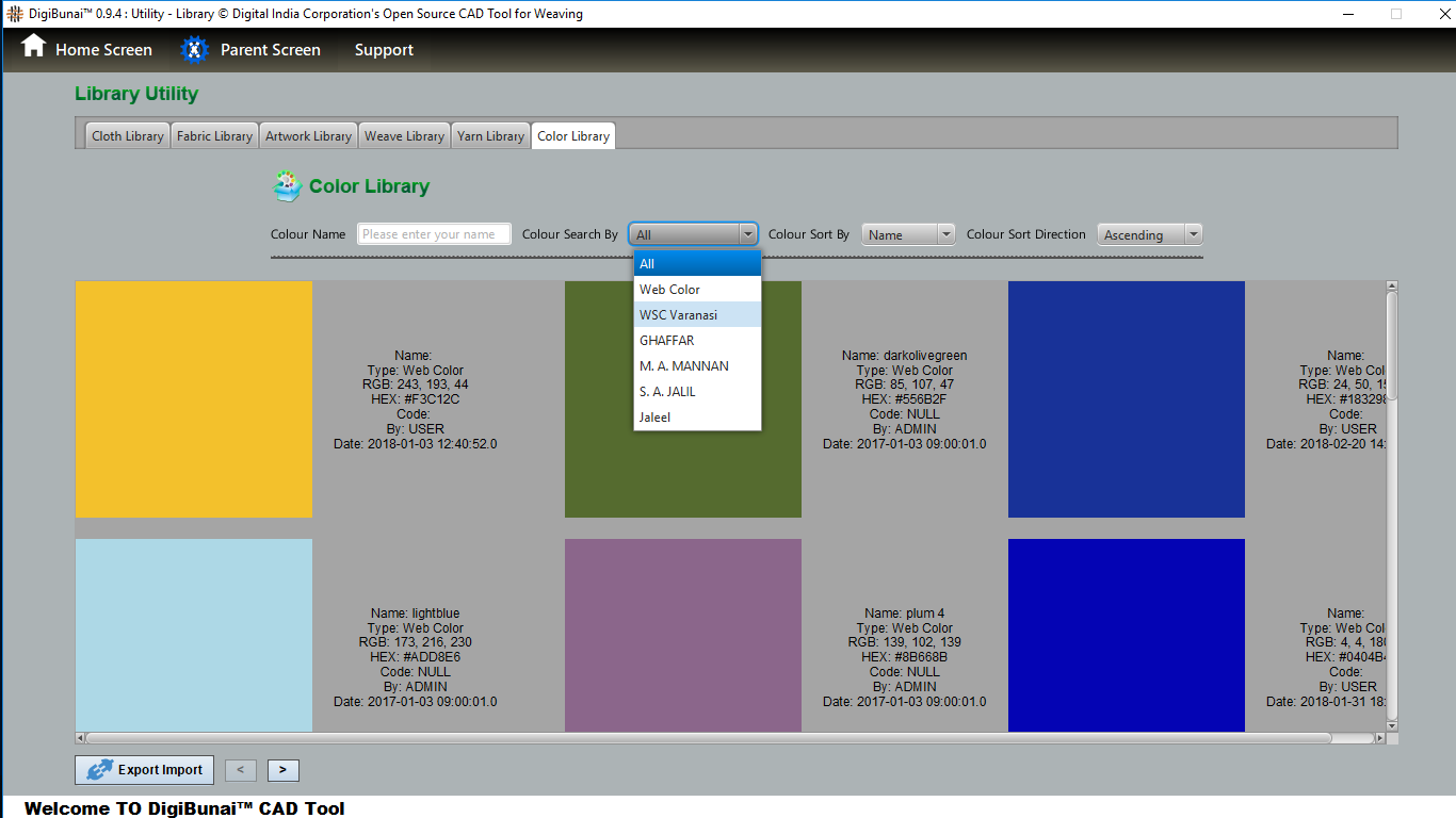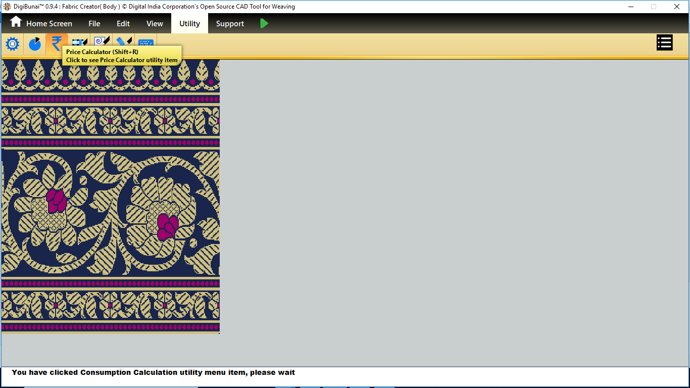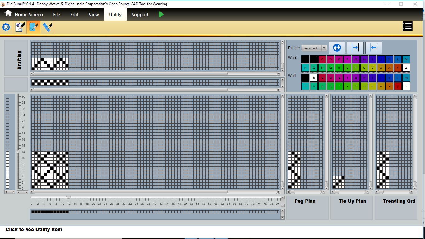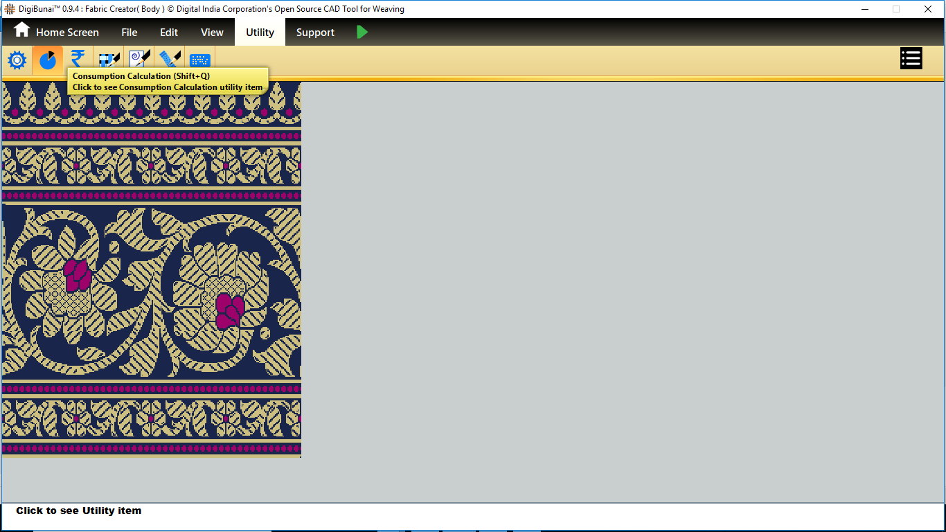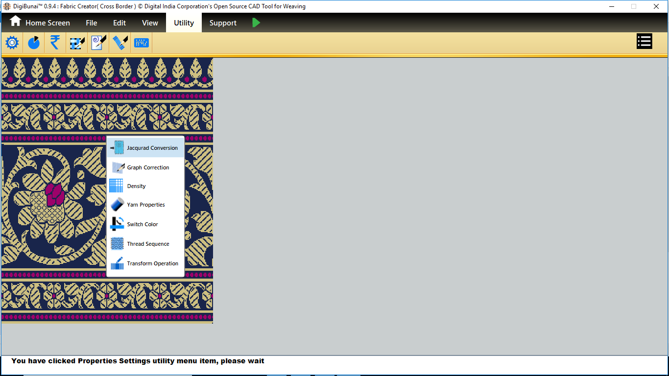 Utility provides facility Export/ Import ( Artwork, Fabric , Weave, Color, Yarn, Cloth), translator, simulator, Palette, Artwork / Fabric Configuration , third party software integration and Help support .