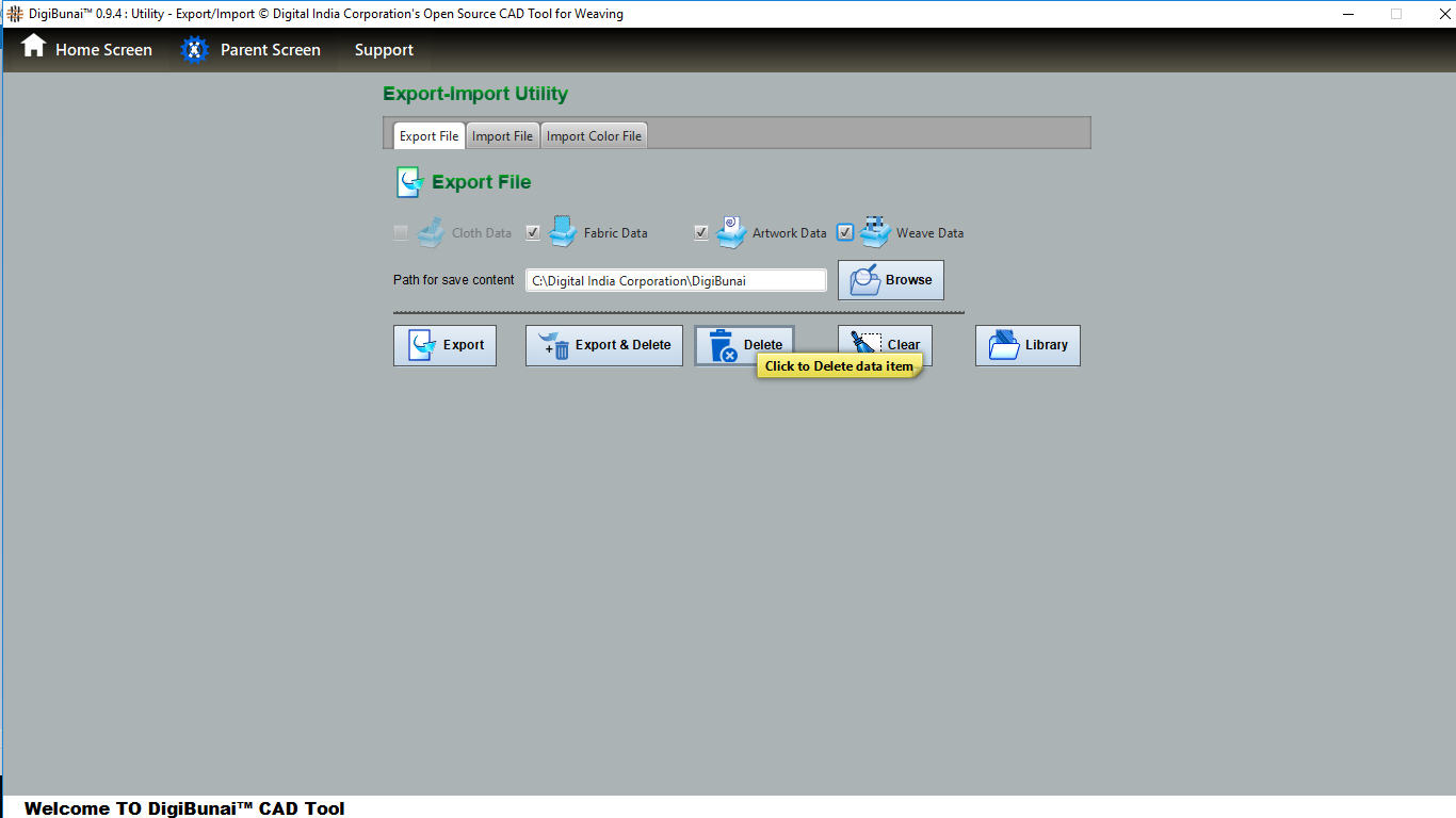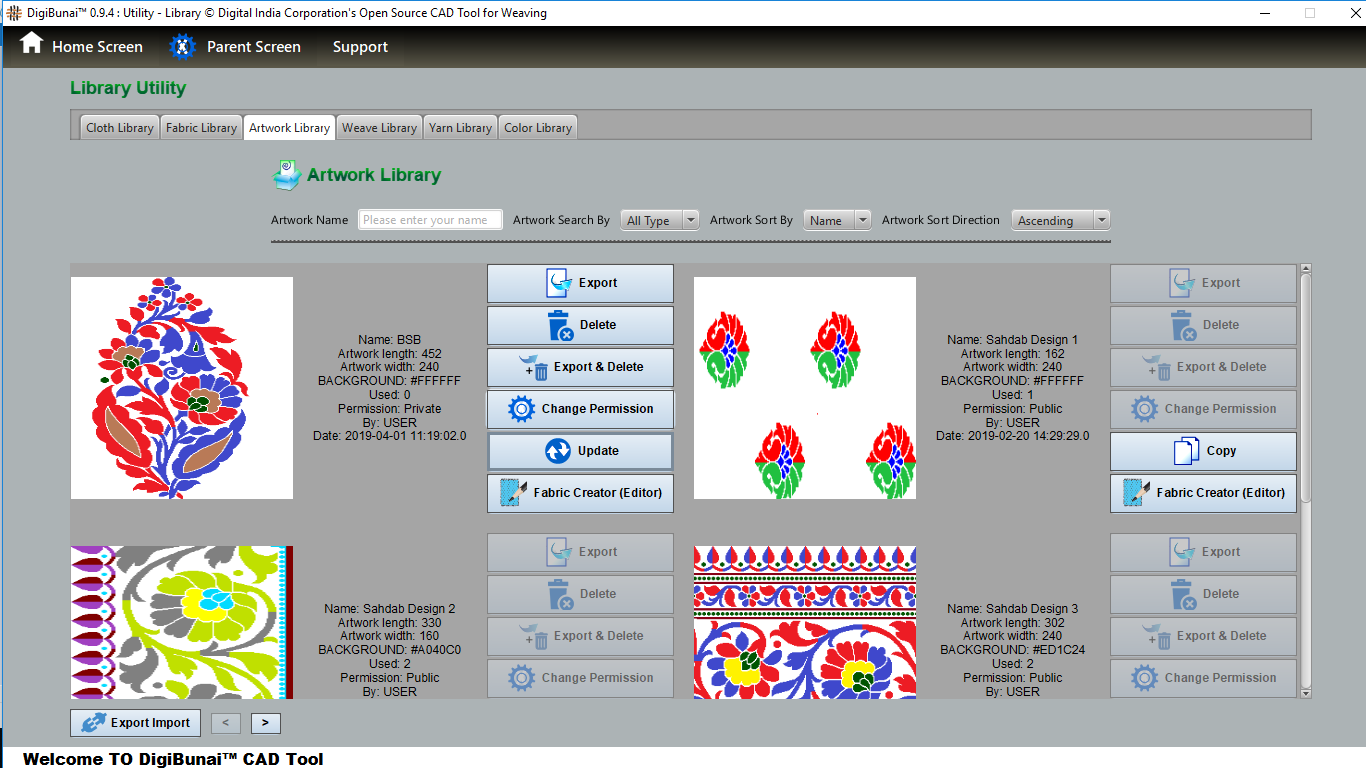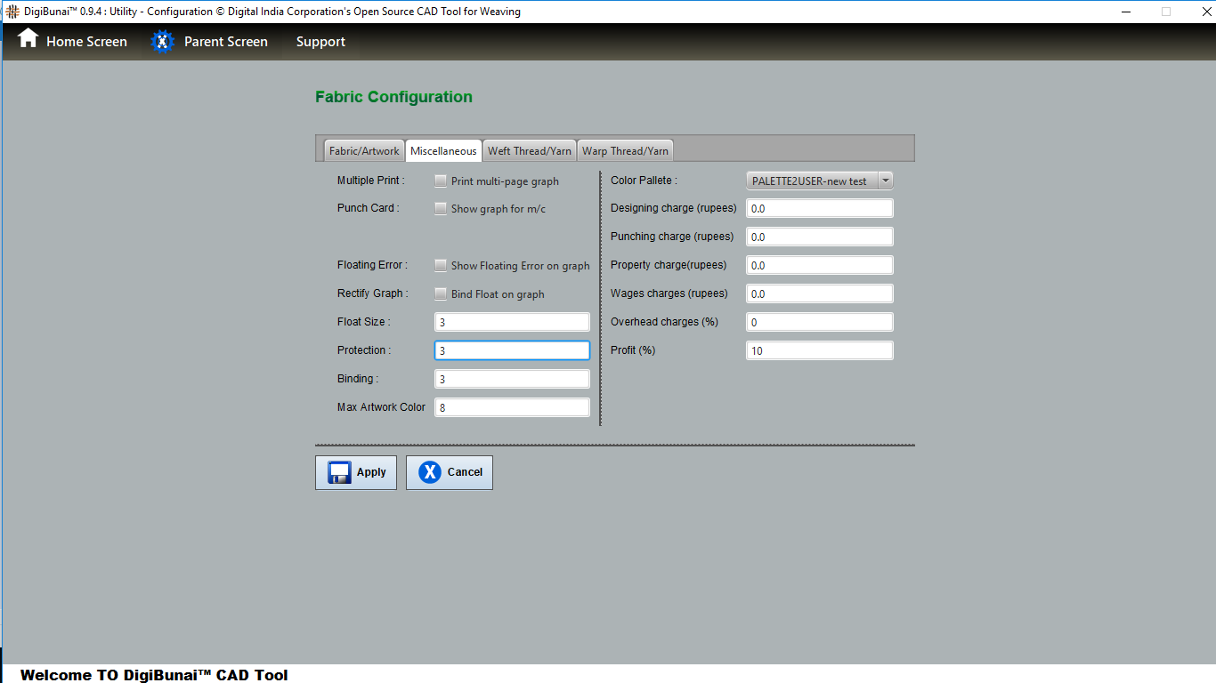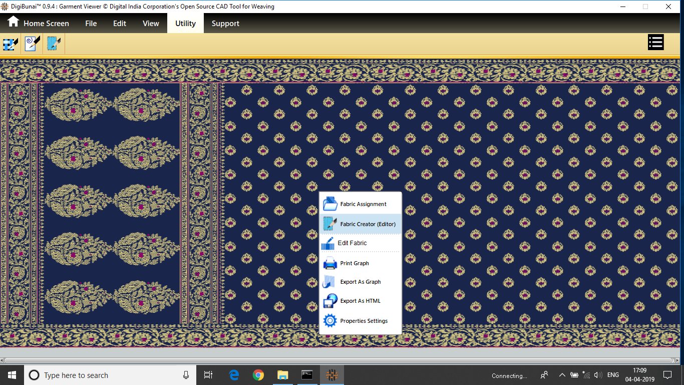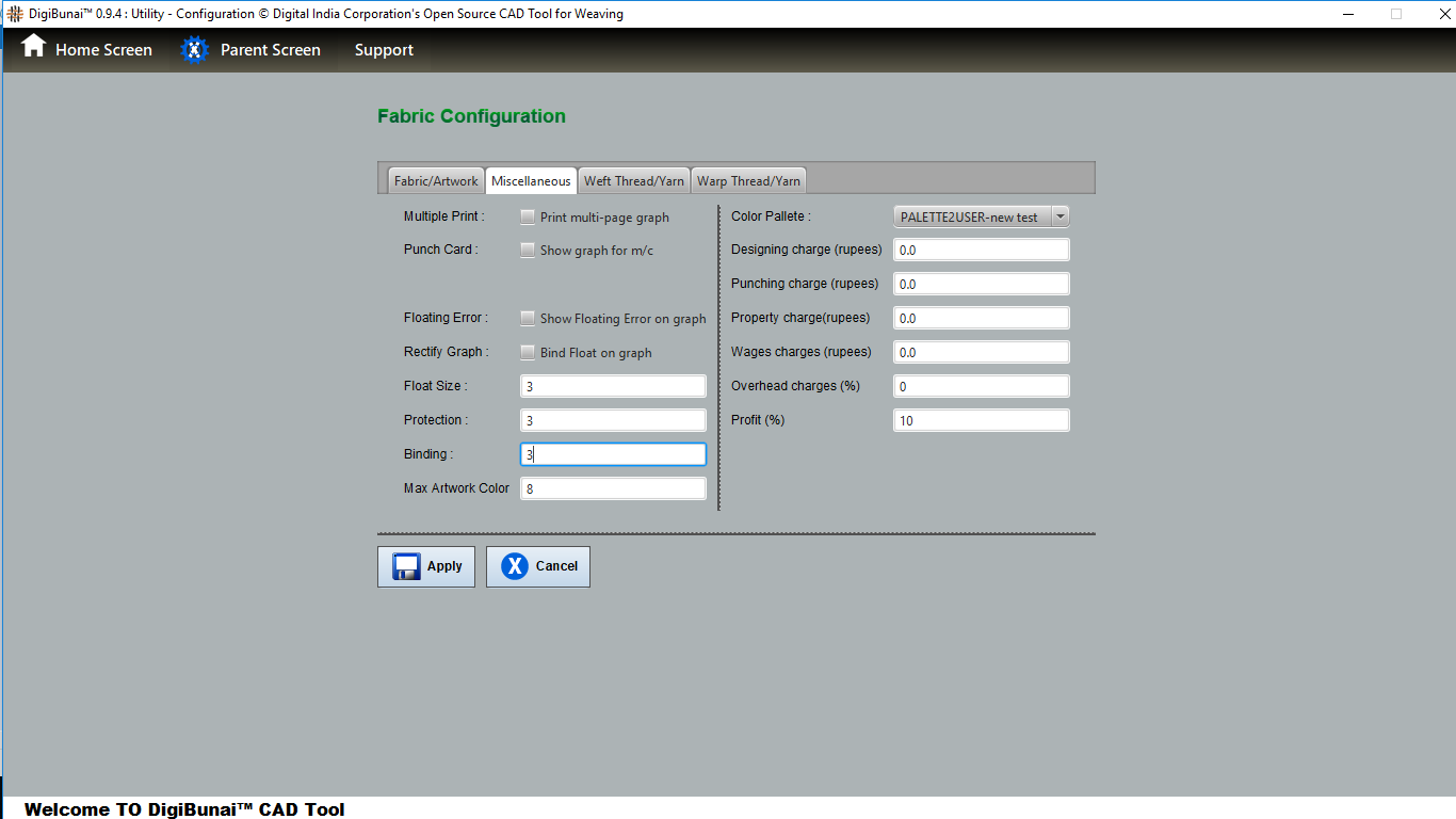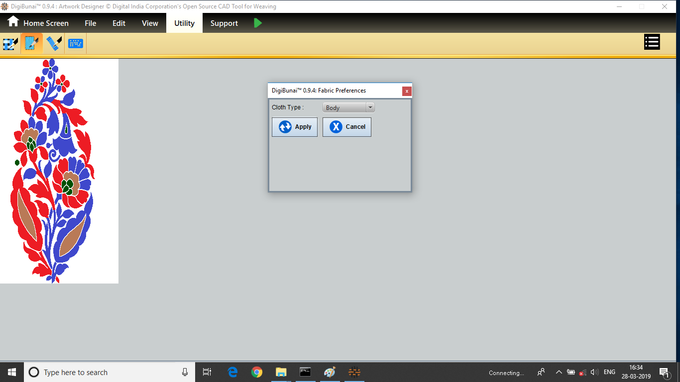 Utility provides facility Export/ Import ( Artwork, Fabric , Weave, Color, Yarn, Cloth), translator, simulator, Palette, Artwork / Fabric Configuration , third party software integration and Help support .