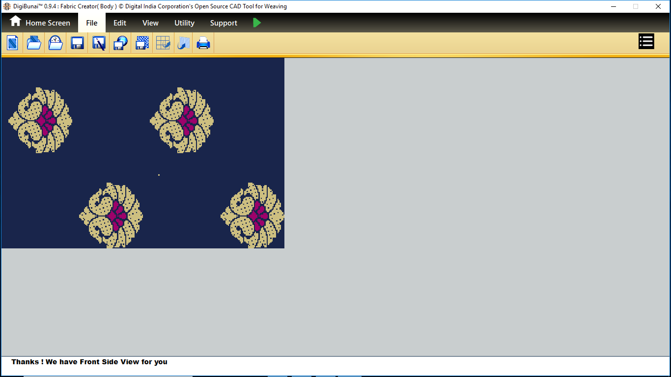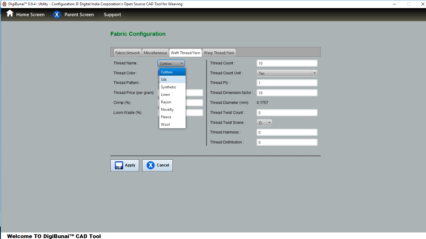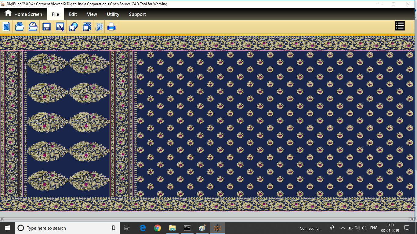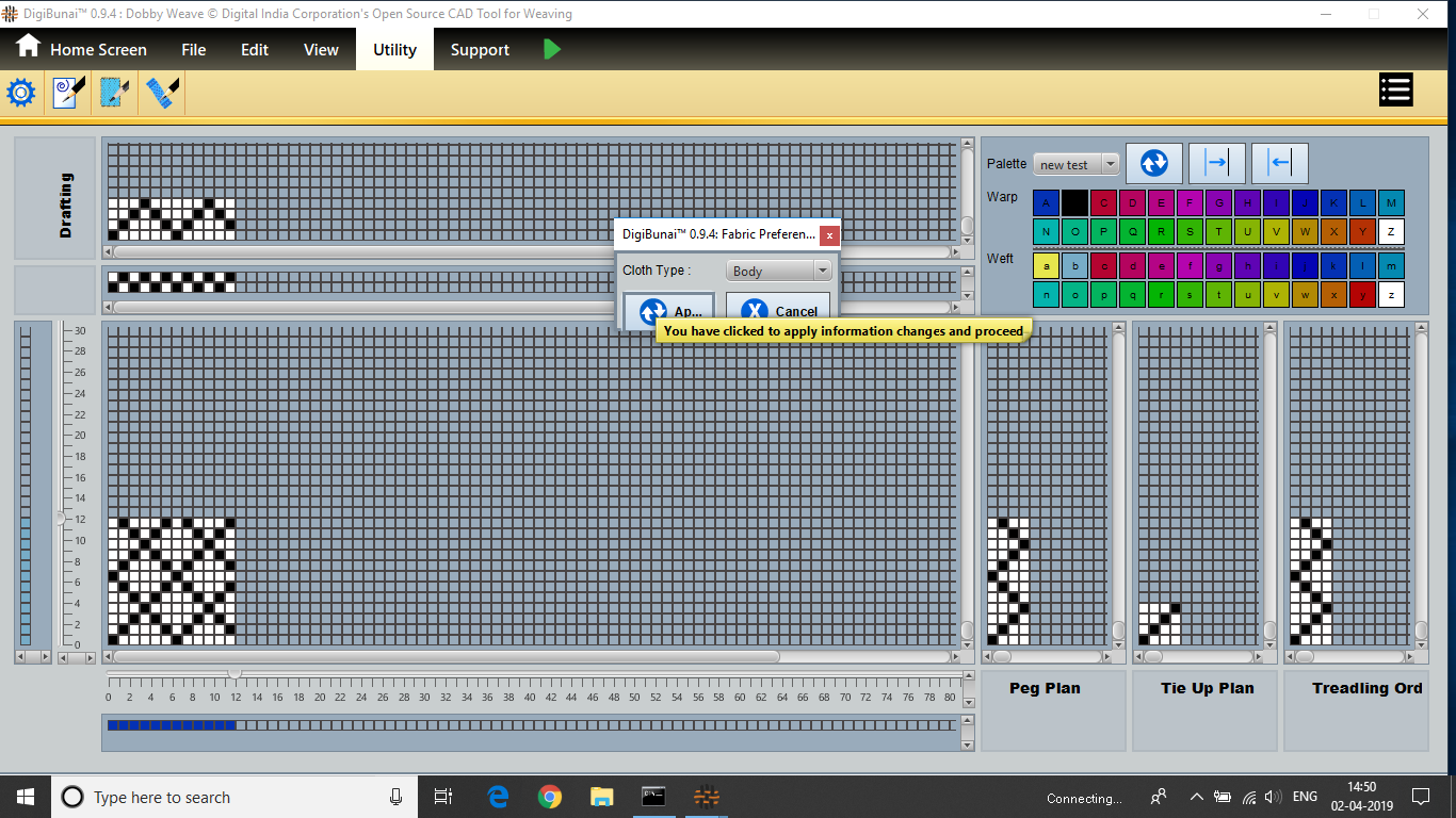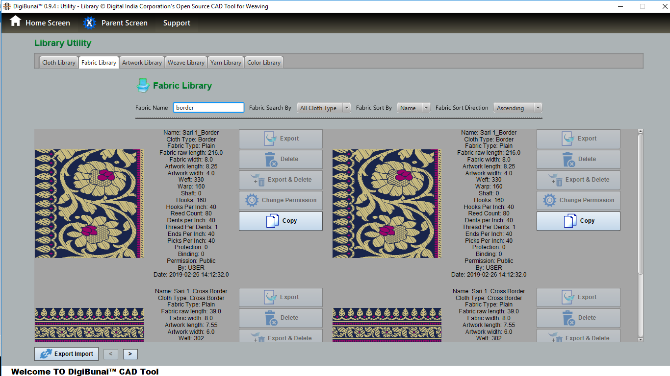 Utility provides facility Export/ Import ( Artwork, Fabric , Weave, Color, Yarn, Cloth), translator, simulator, Palette, Artwork / Fabric Configuration , third party software integration and Help support .