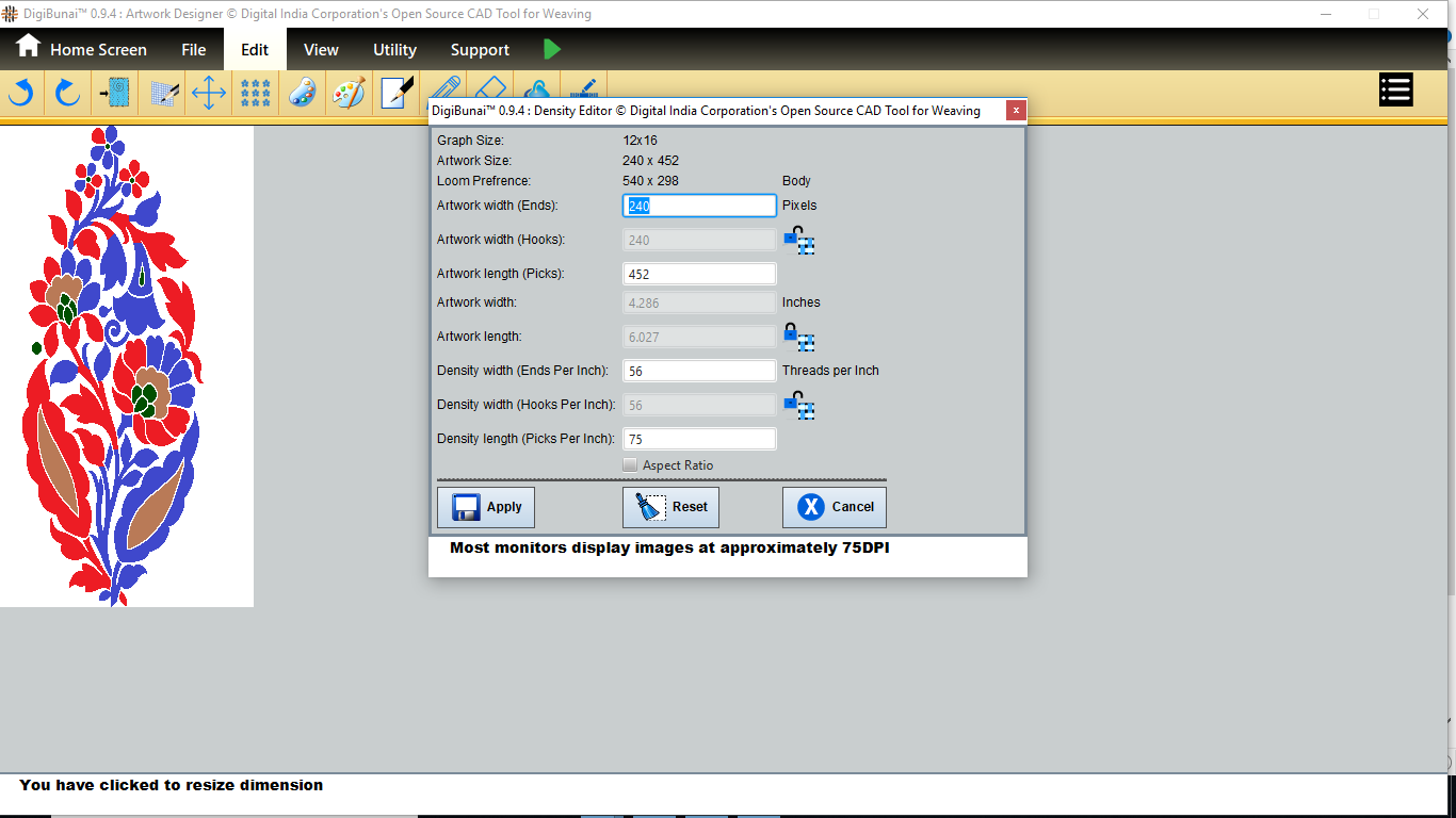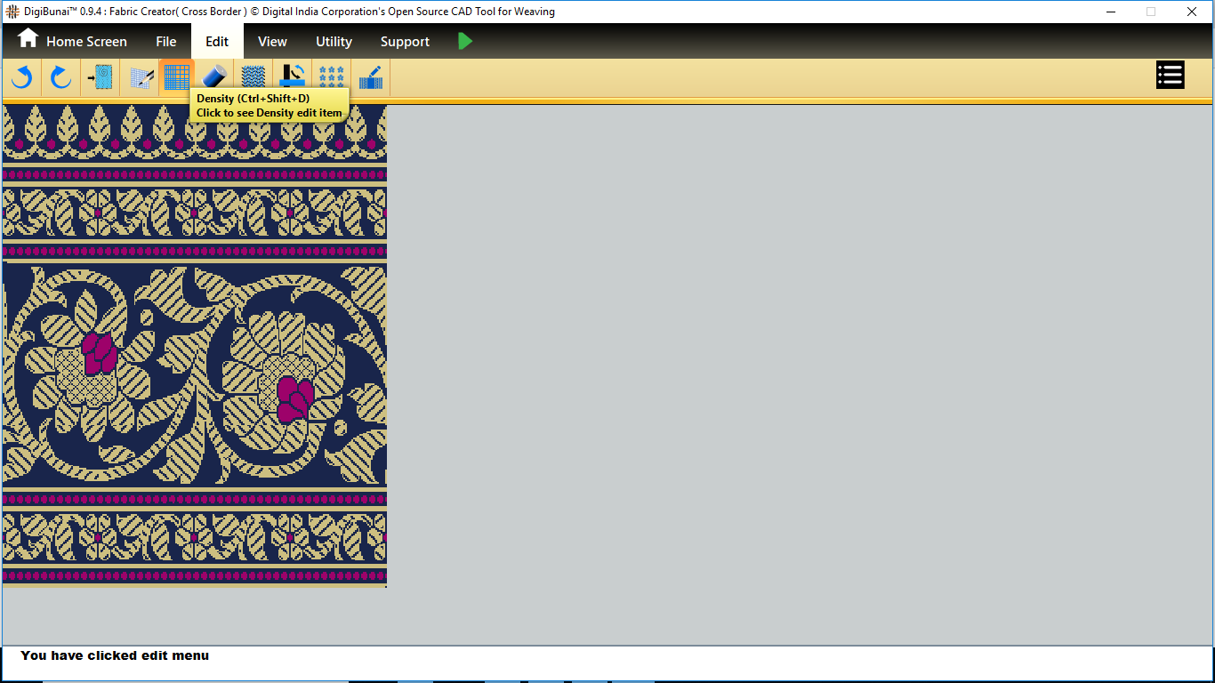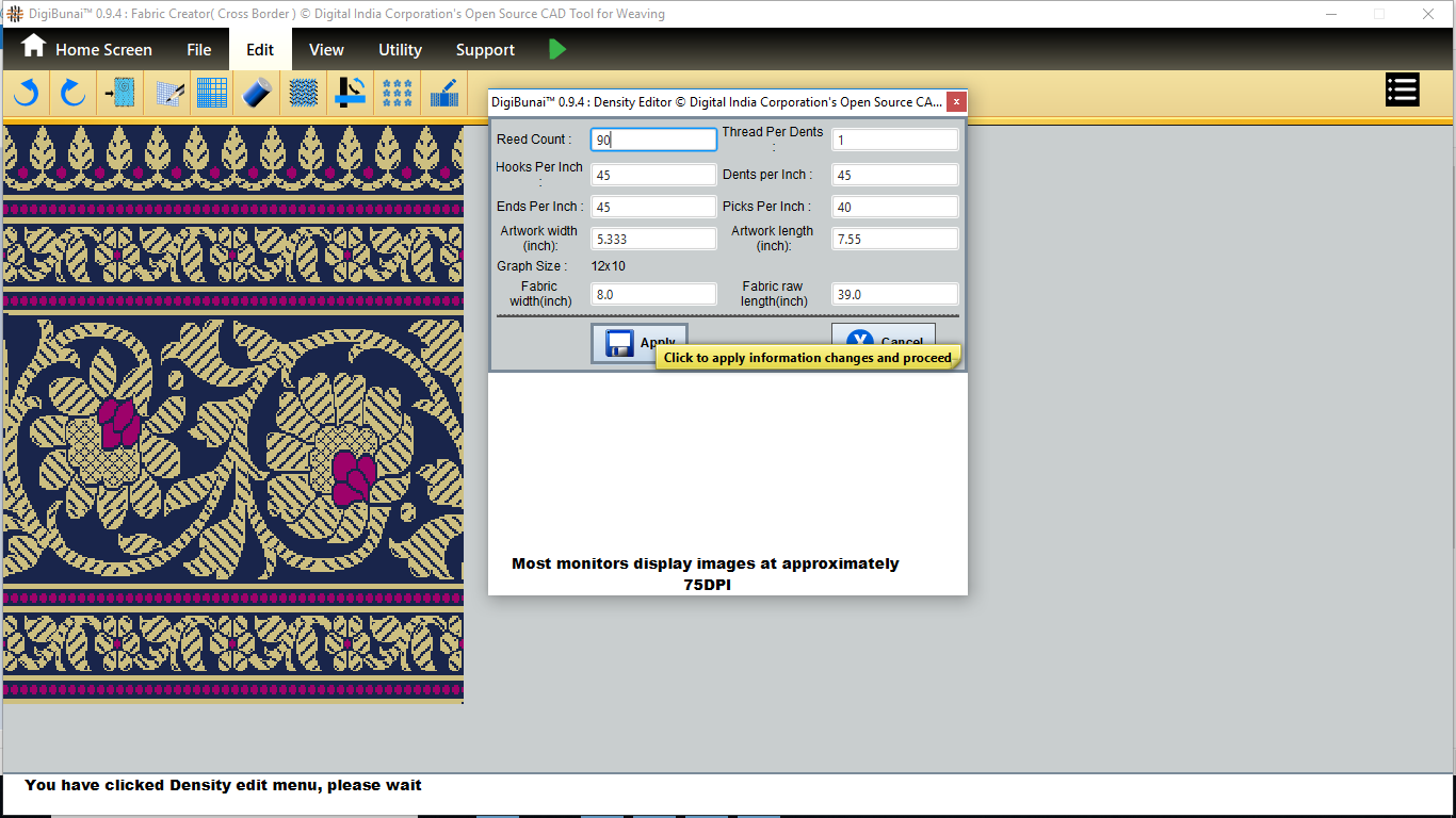 User wants to change density of fabric by clicking density button and change reed count , EPI and PPI in edit menu under Fabric Creator .