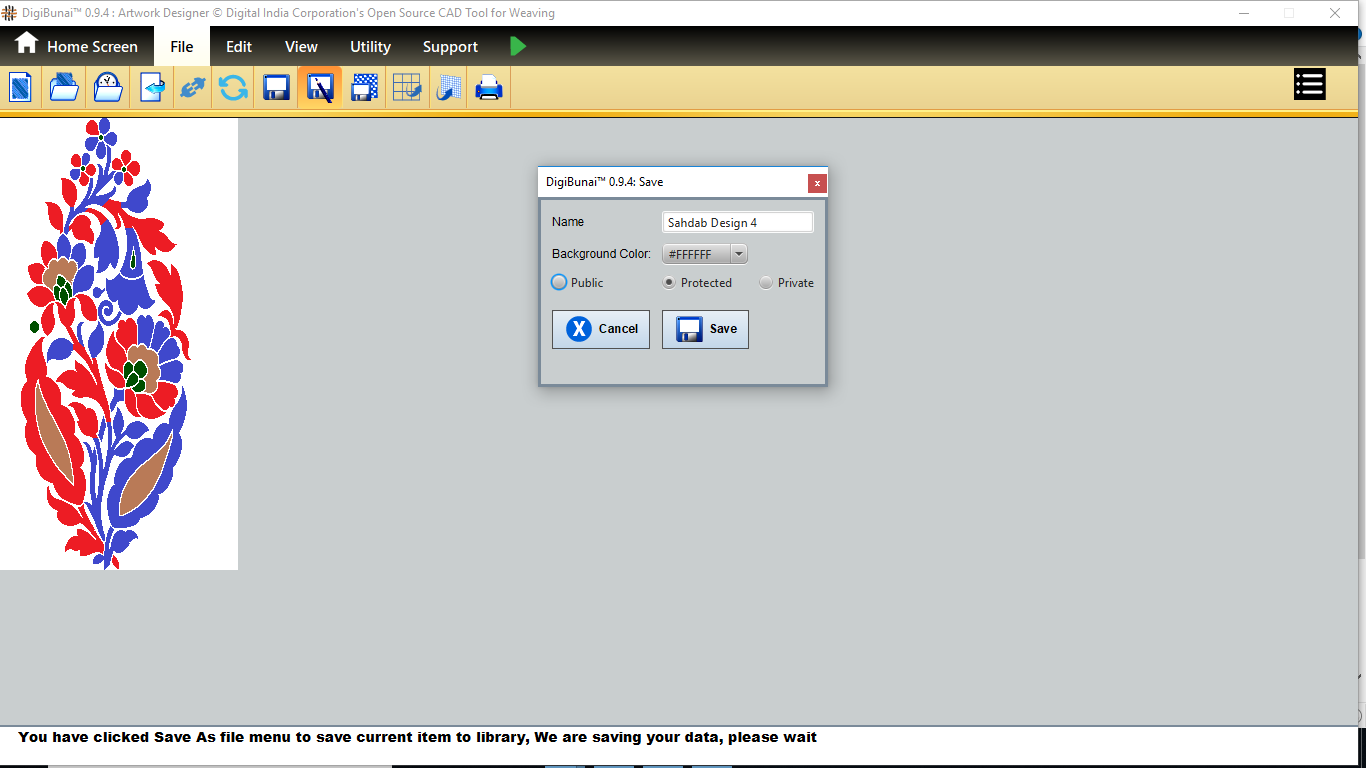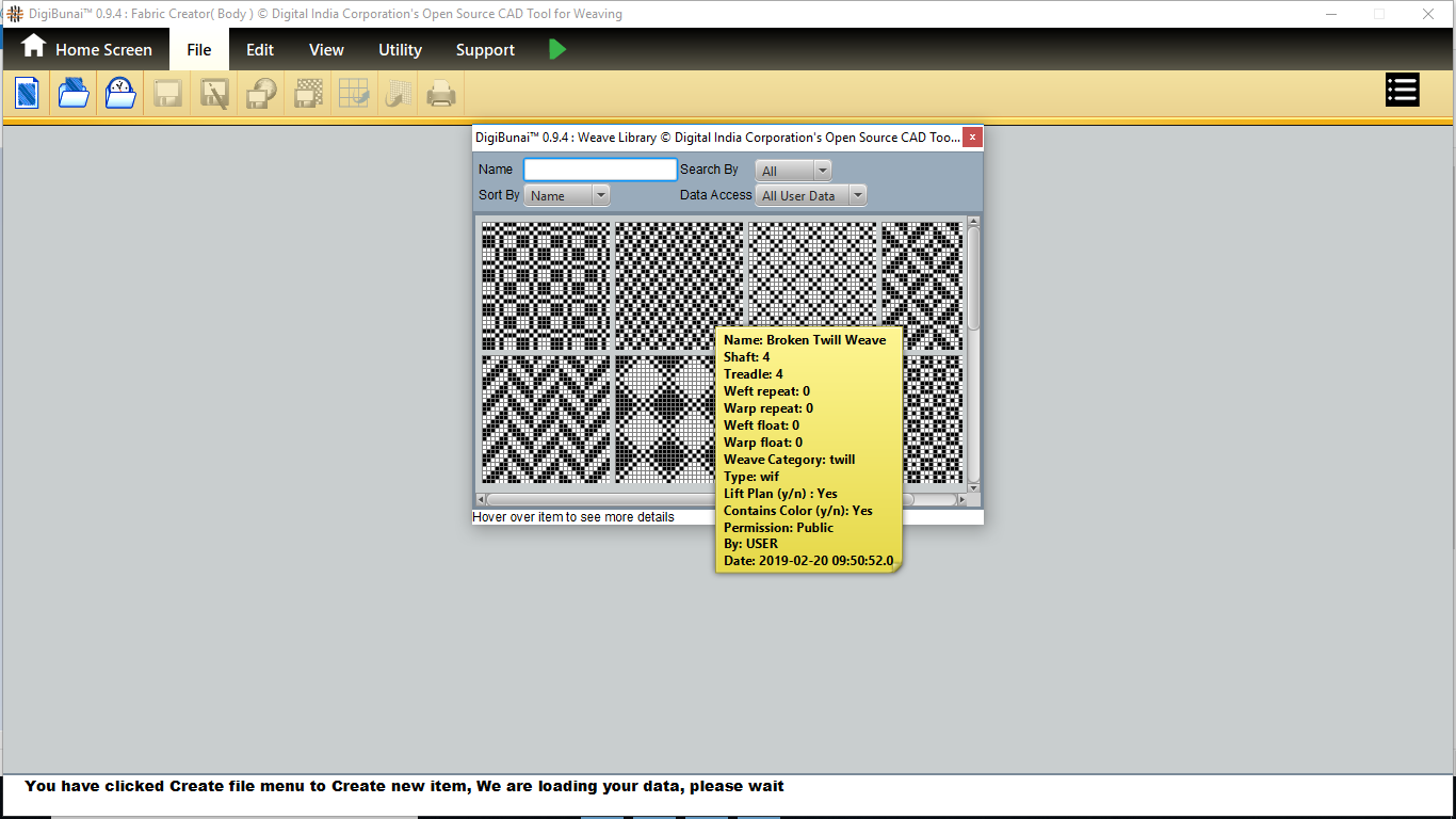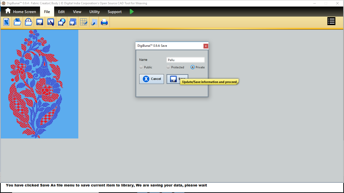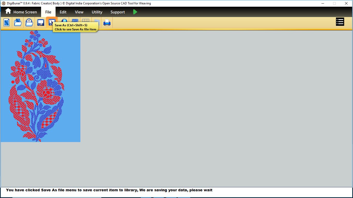 User can make a weave or import and edit weave. Then weave can be saved with specific weave name in weave library by clicking button save under file menu in Dobby Weave.