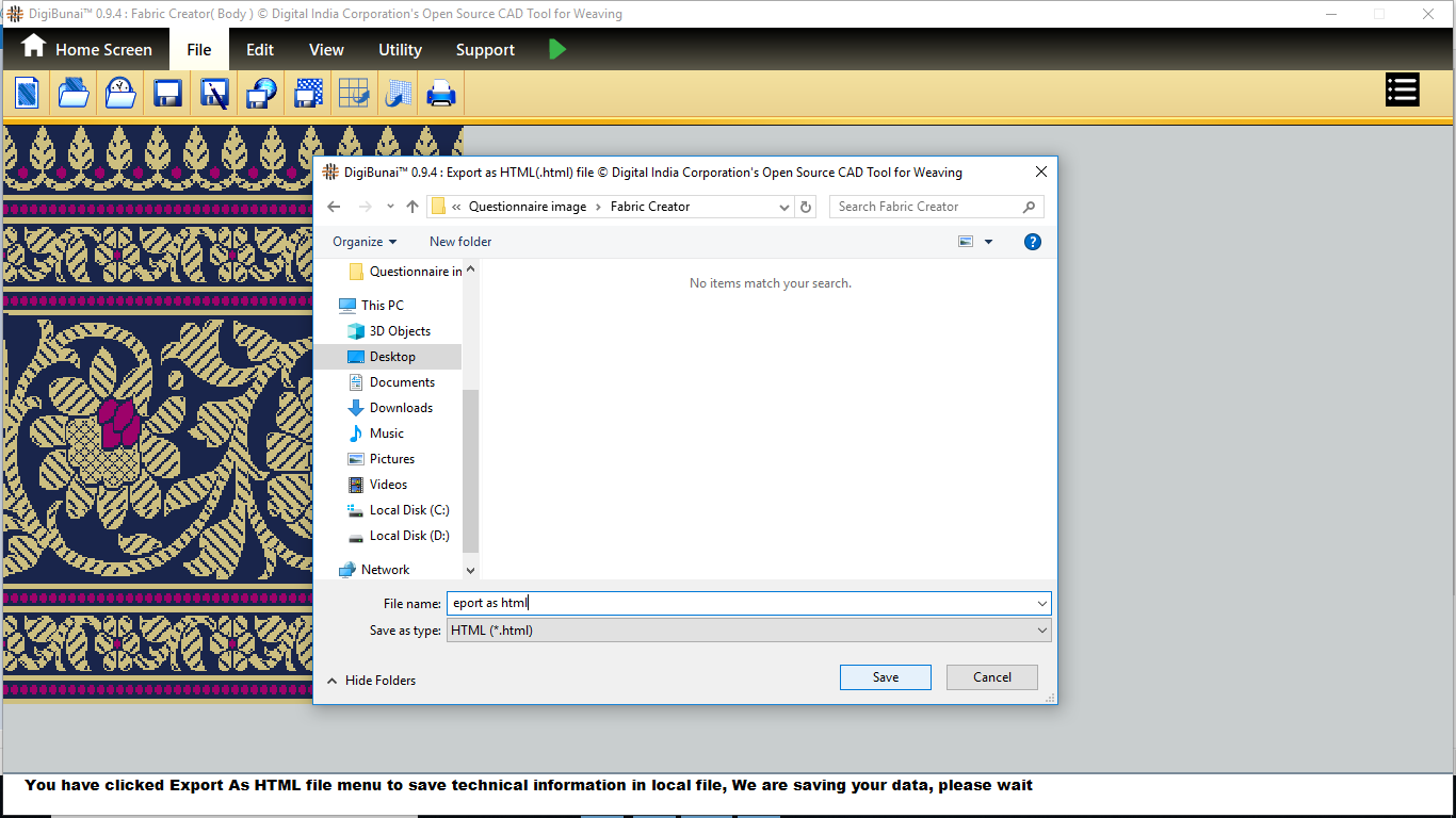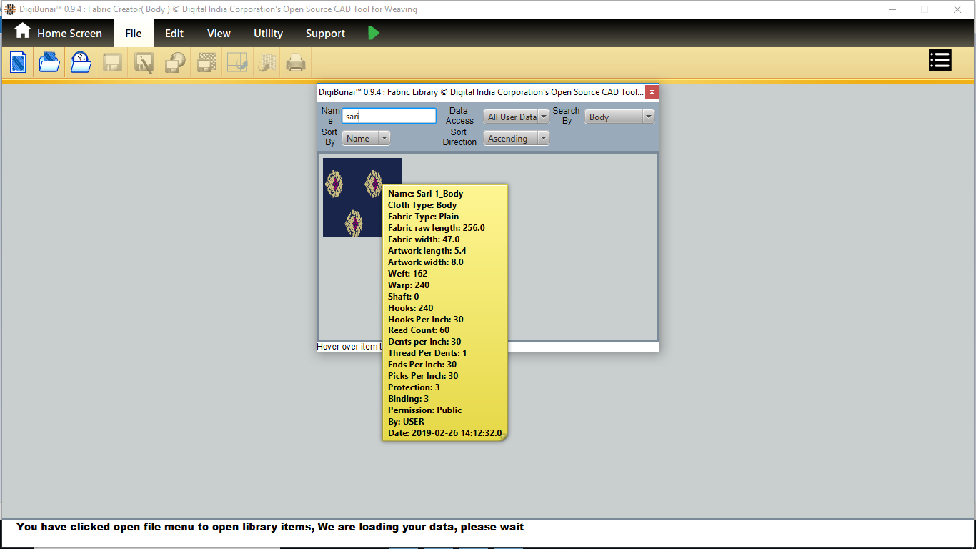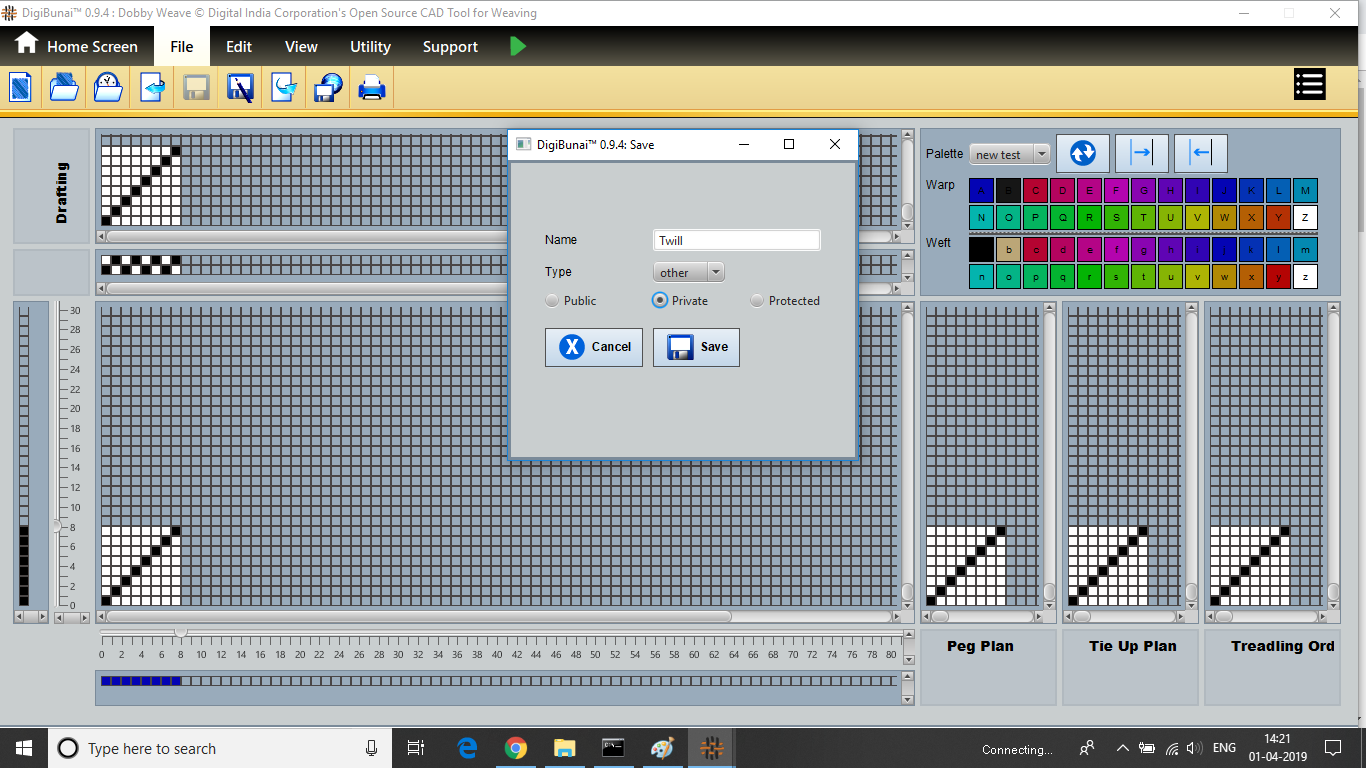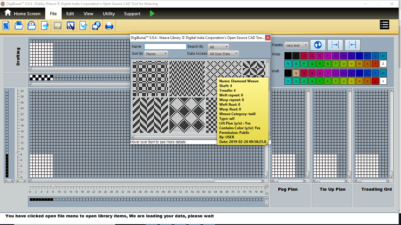 User can make a weave or import and edit weave. Then weave can be saved with specific weave name in weave library by clicking button save under file menu in Dobby Weave.