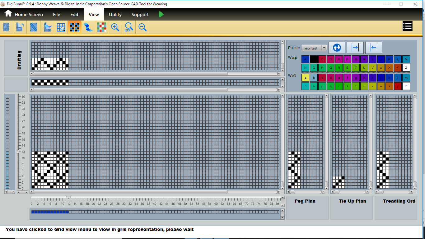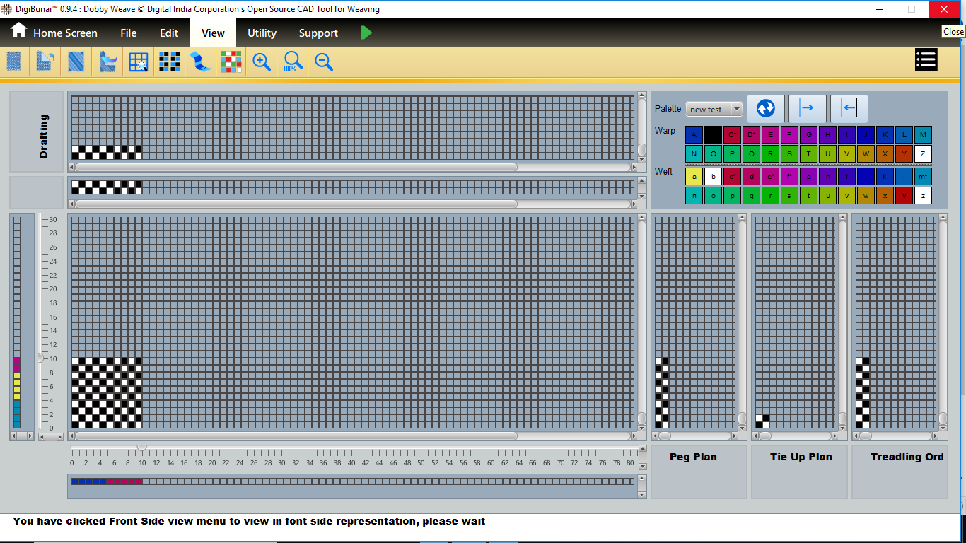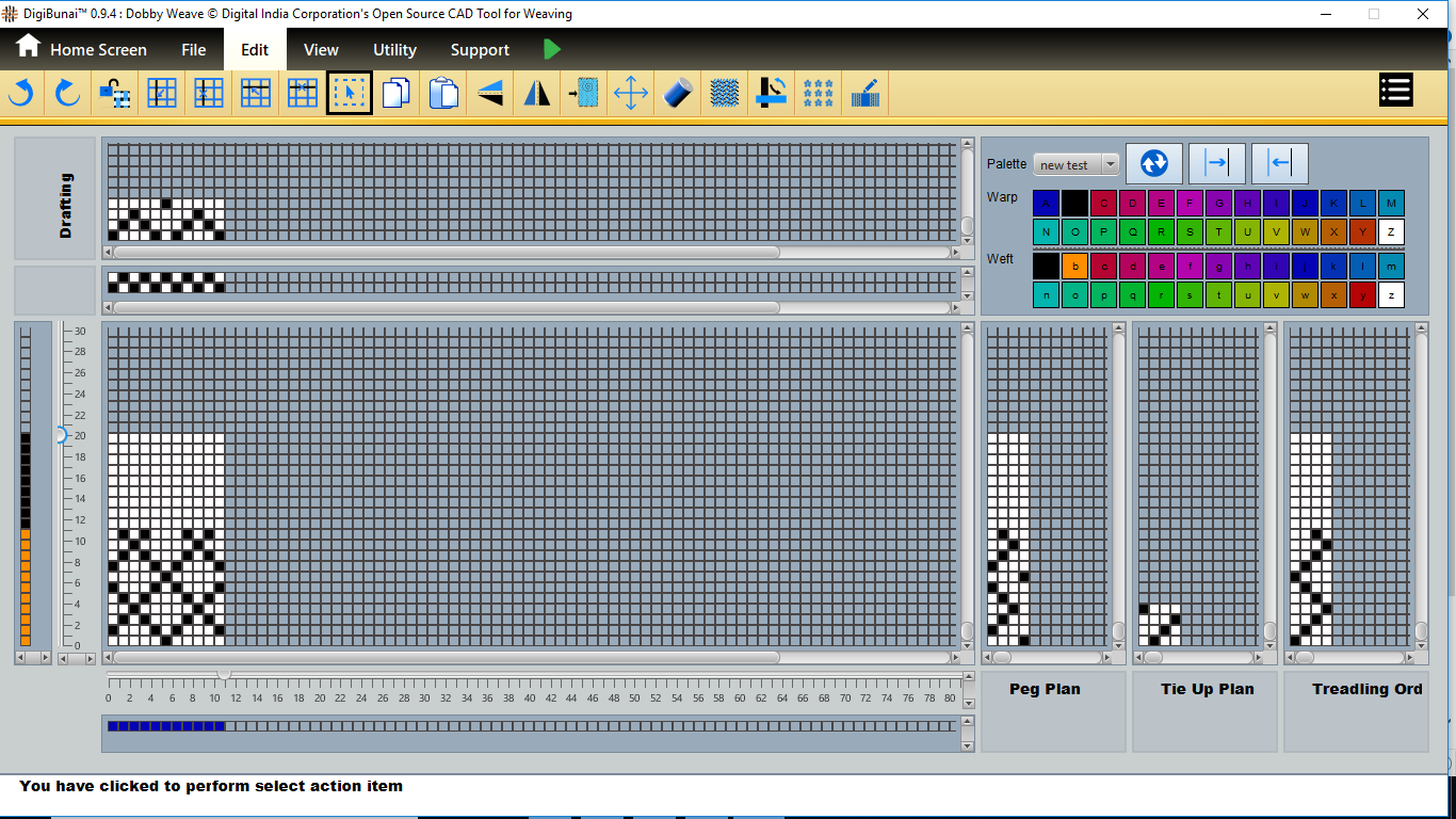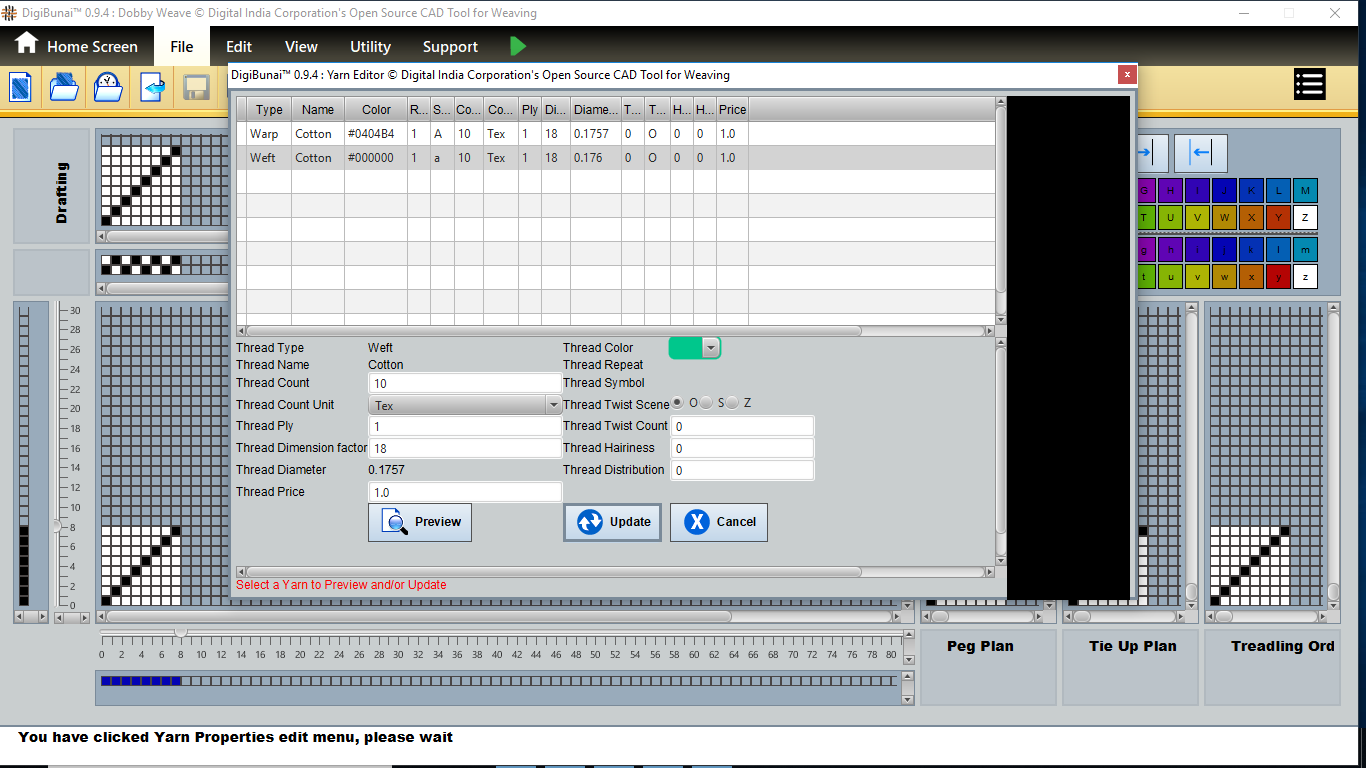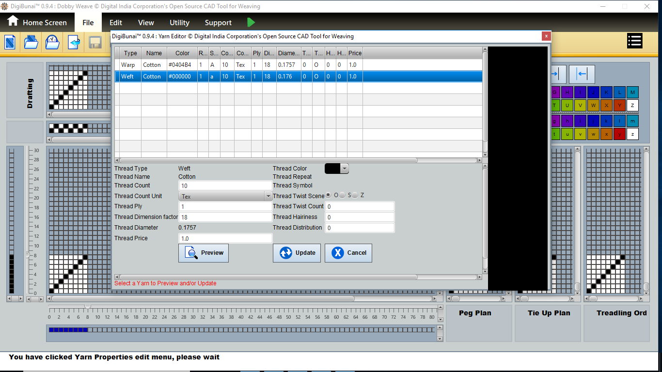 User wants to see pegplan & tieup of weave design by creating design with drafting and treadling sequence in file menu under Dobby Weave.