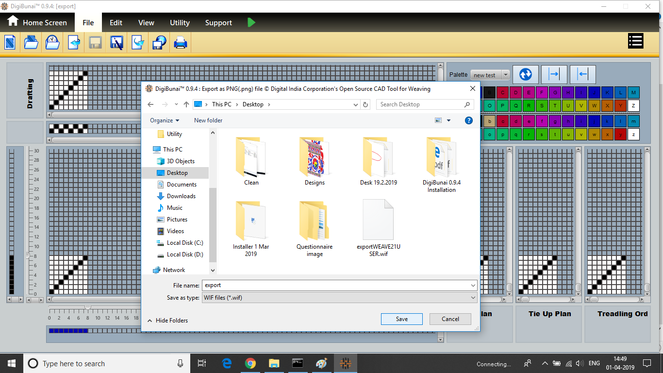 User can export design in wif file format by edit, insert (warp and weft), delete (warp and weft), mirroring, rotation by clicking export button in Dobby Weave.