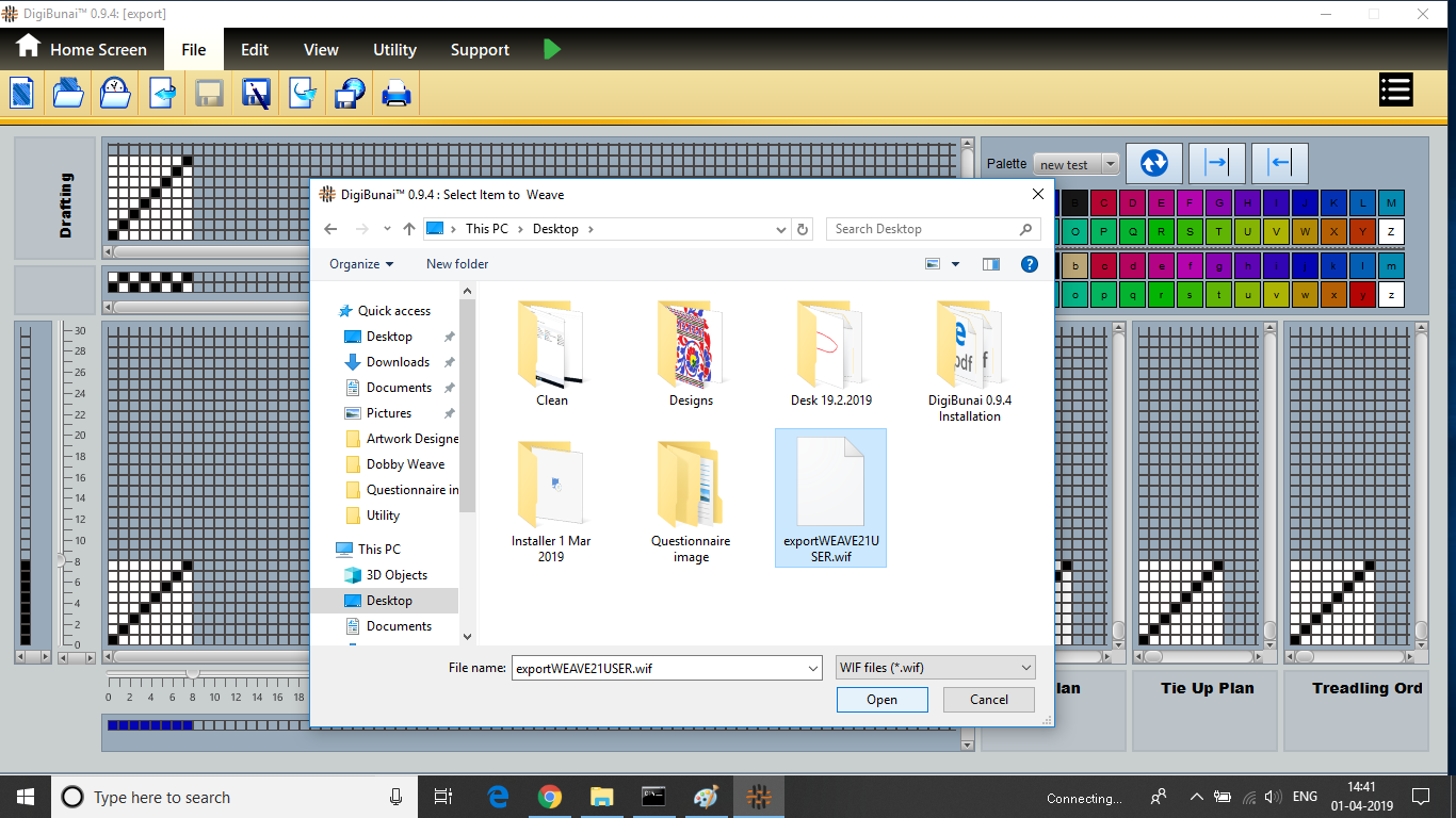 Dobby Weave provides facility import a weave image in wif file format make by DigiBunai software .Editor can help edit, insert (warp and weft), delete (warp and weft), mirroring, rotation. Then design can export in desired drive and save in library.