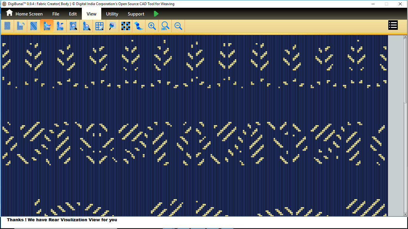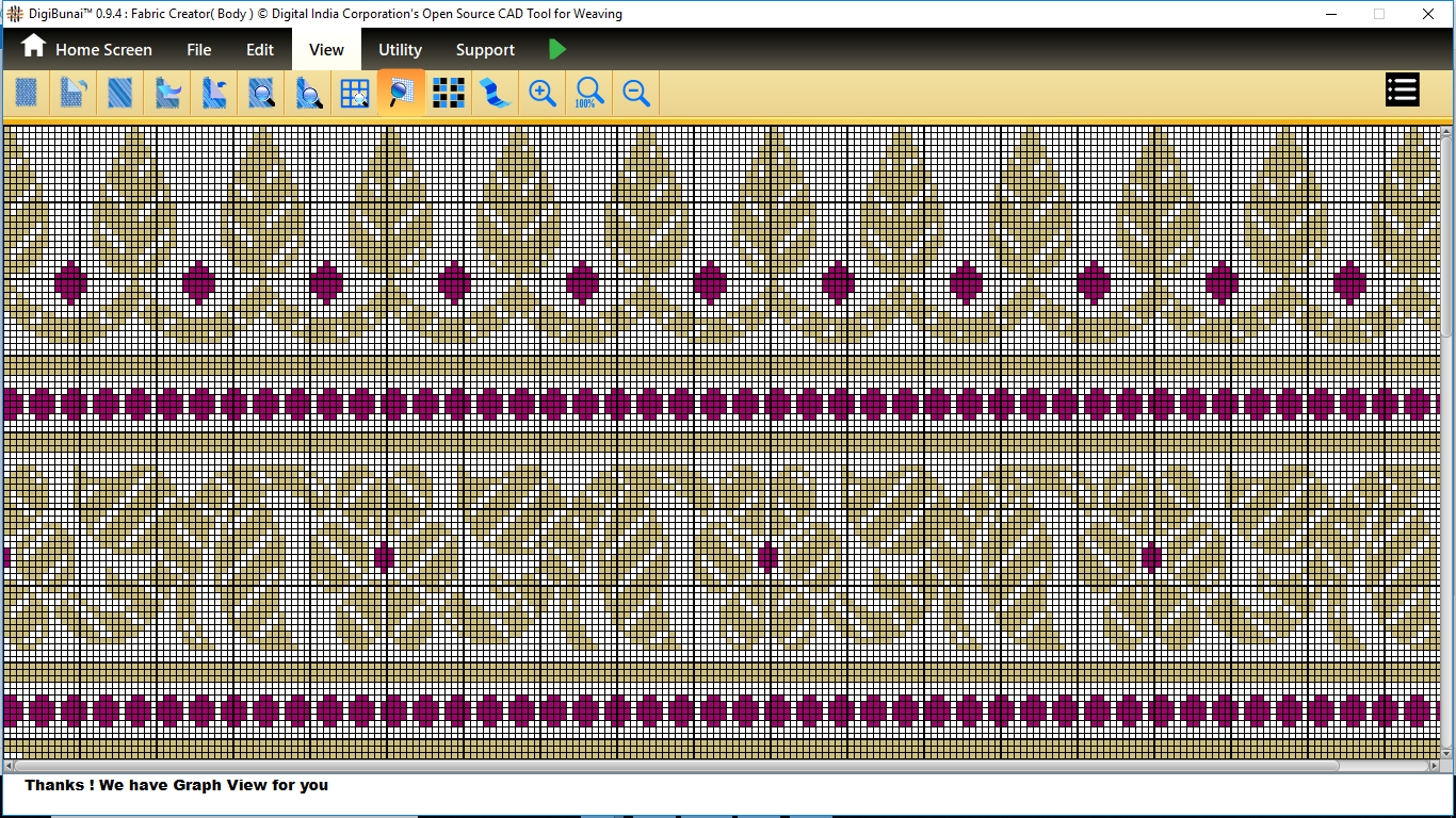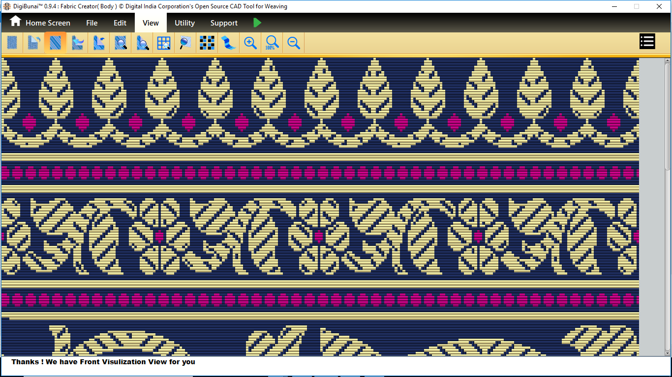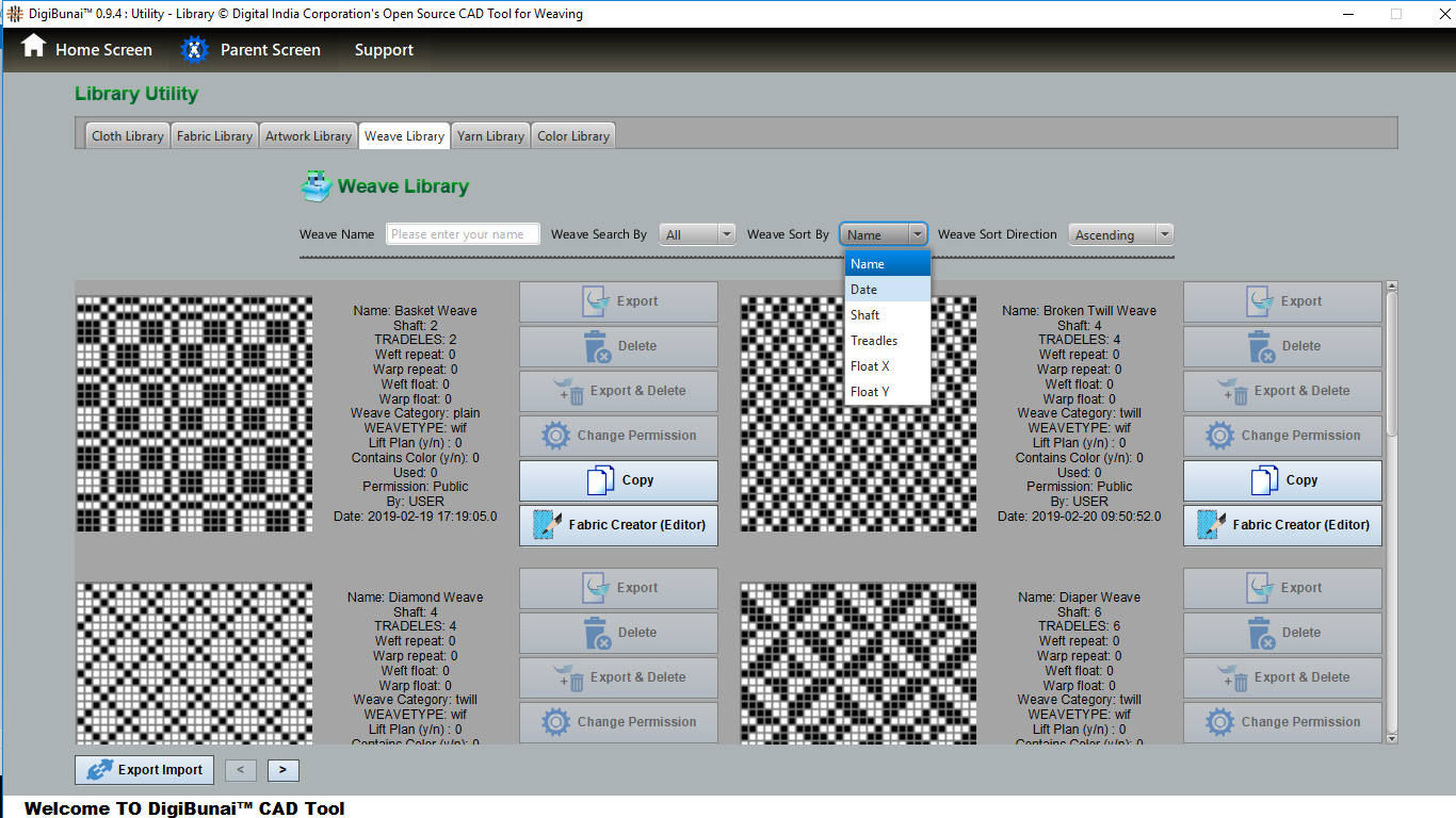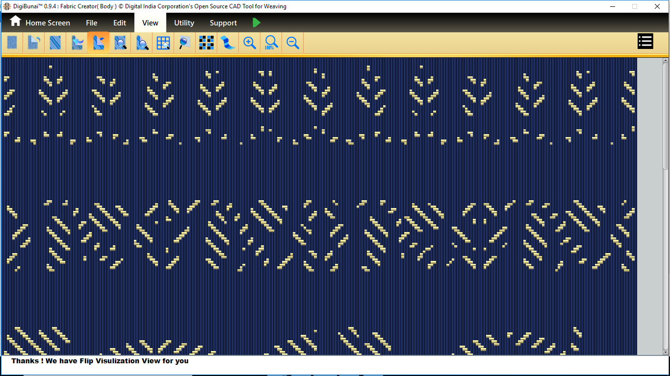 Fabric Creator provides Create fabric, edit weaves, Create thread pattern in base fabric. Weave using extra wefts Facility to change yarn properties. Different view of the fabric (Front, Back, Flip).Create customizable graph of one repeat of fabric (Handloom Jacquard).