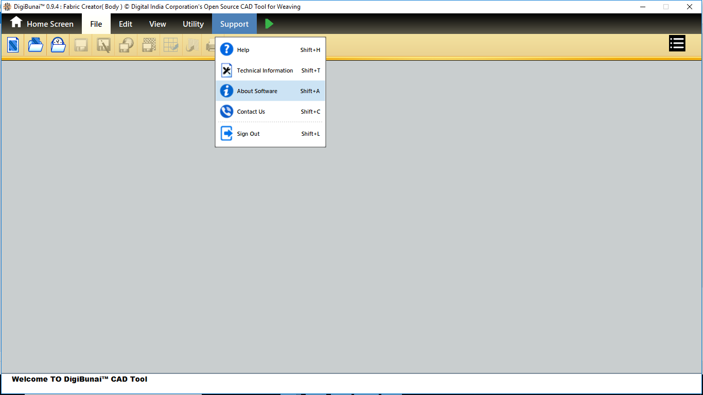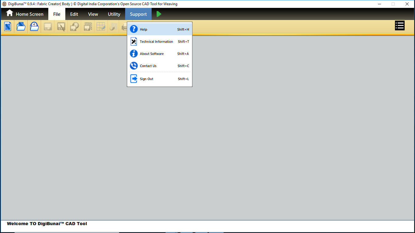 User wants to help and technical for DigiBunai software by clicking support menu and selecting help and technical information menubar in Artwork designer , Fabric creator,dobby weave and Garment viewer module.