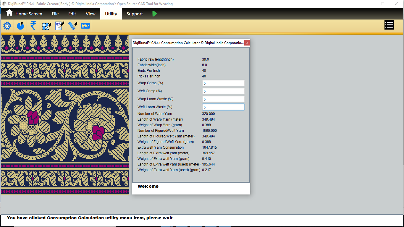 User wants to find consumption calculation of fabric by clicking consumption calculation button and giving input value of warp crimp, weft crimp,warp loom waste and weft loom waste in utility under Fabric Creator.