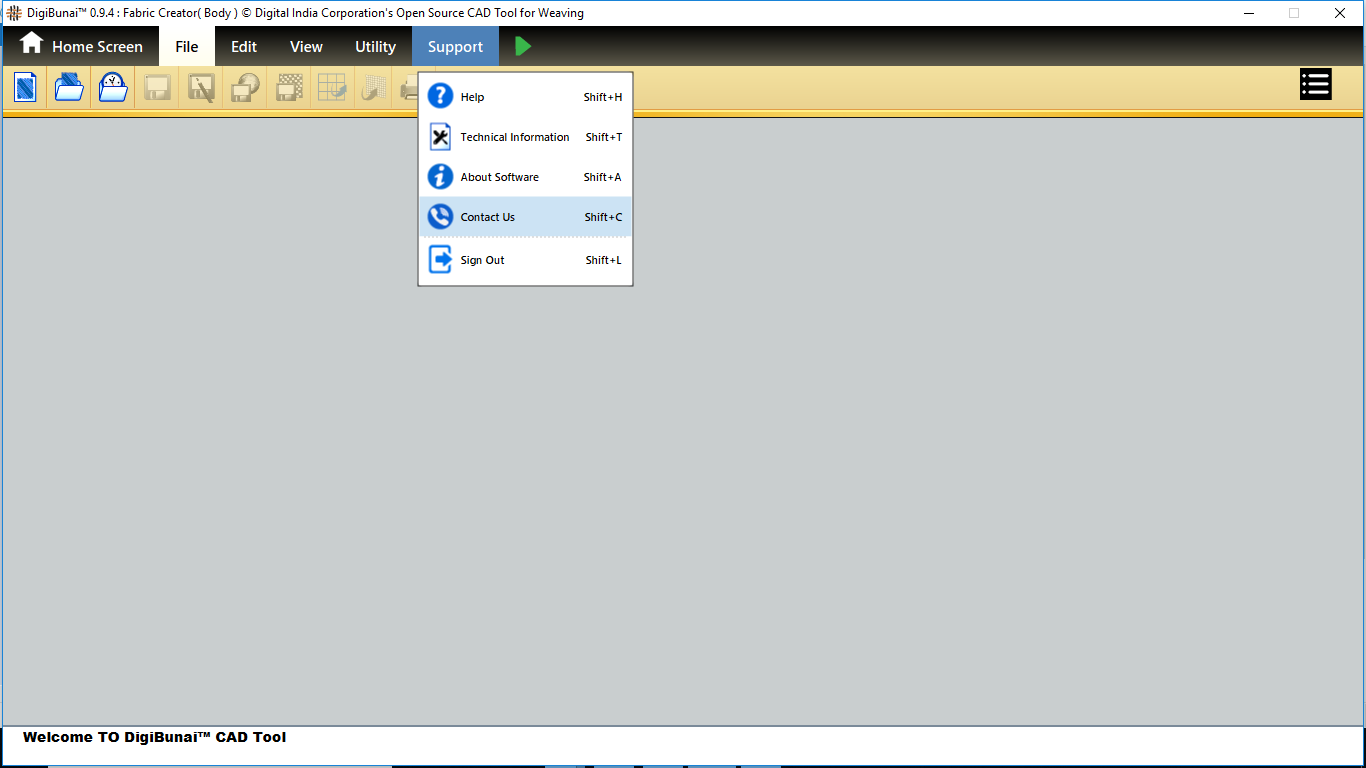 User wants to see about software and contact support for software issue in DigiBunai software by clicking support menu and selecting about software and contact us menubar in Artwork designer , Fabric creator, dobby weave and Garment viewer module.