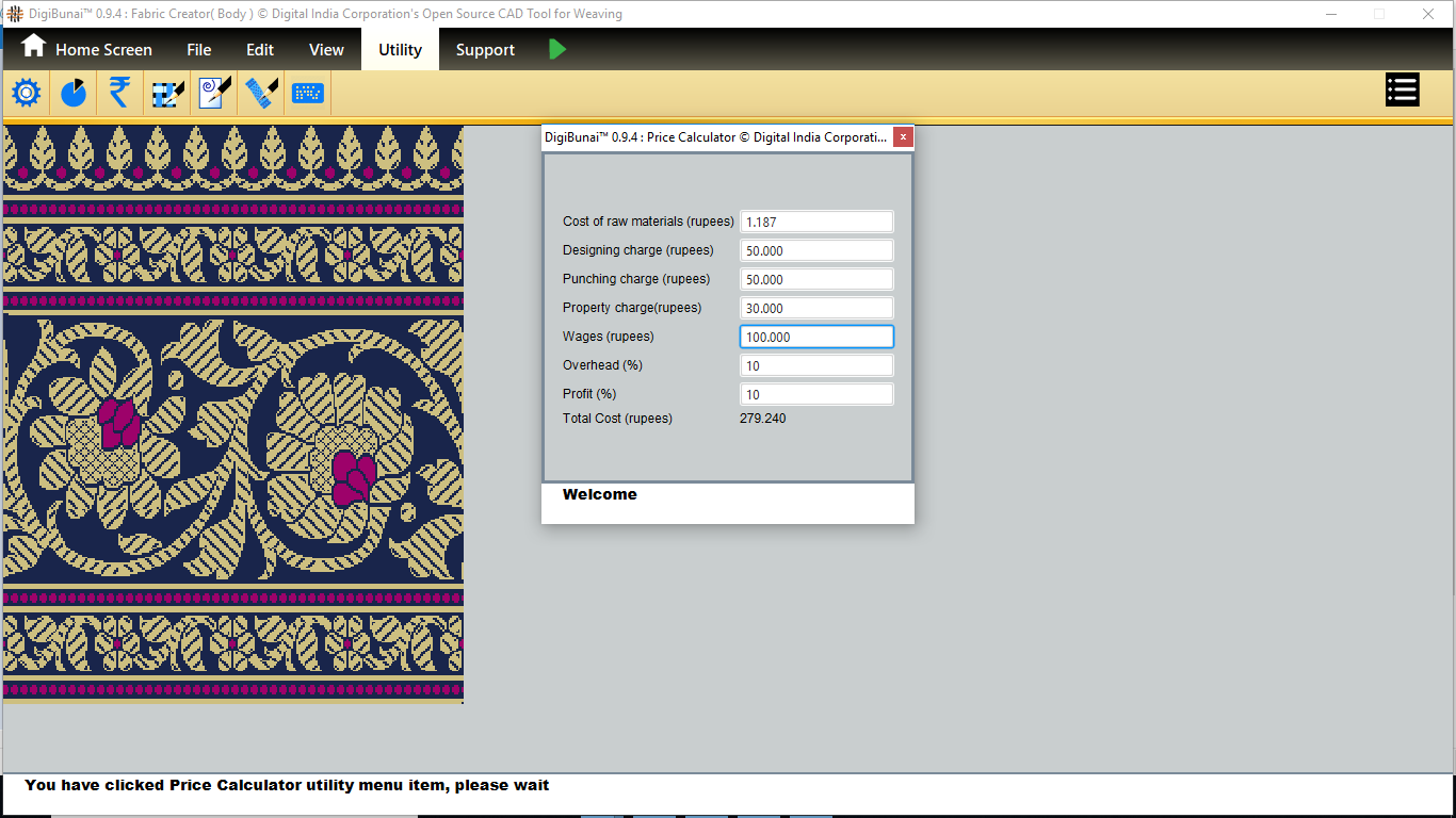 User wants to find total cost of material by clicking price calculator button and giving input designing charges, punching charges, property charge, wages, overhead and profit in utility under Fabric Creator.
