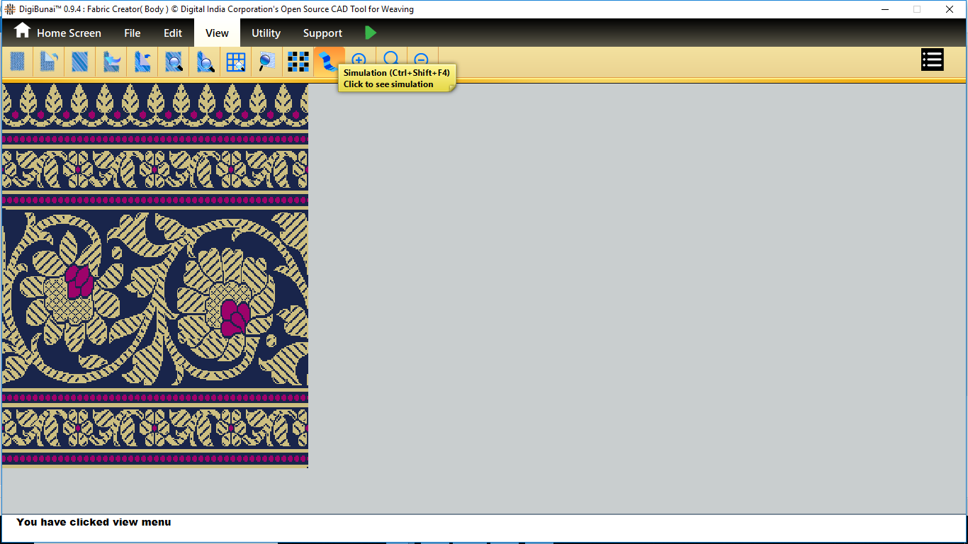 User wants to see simulation of fabric (saree layout) by clicking simulation button in view menu under Garment Viewer.