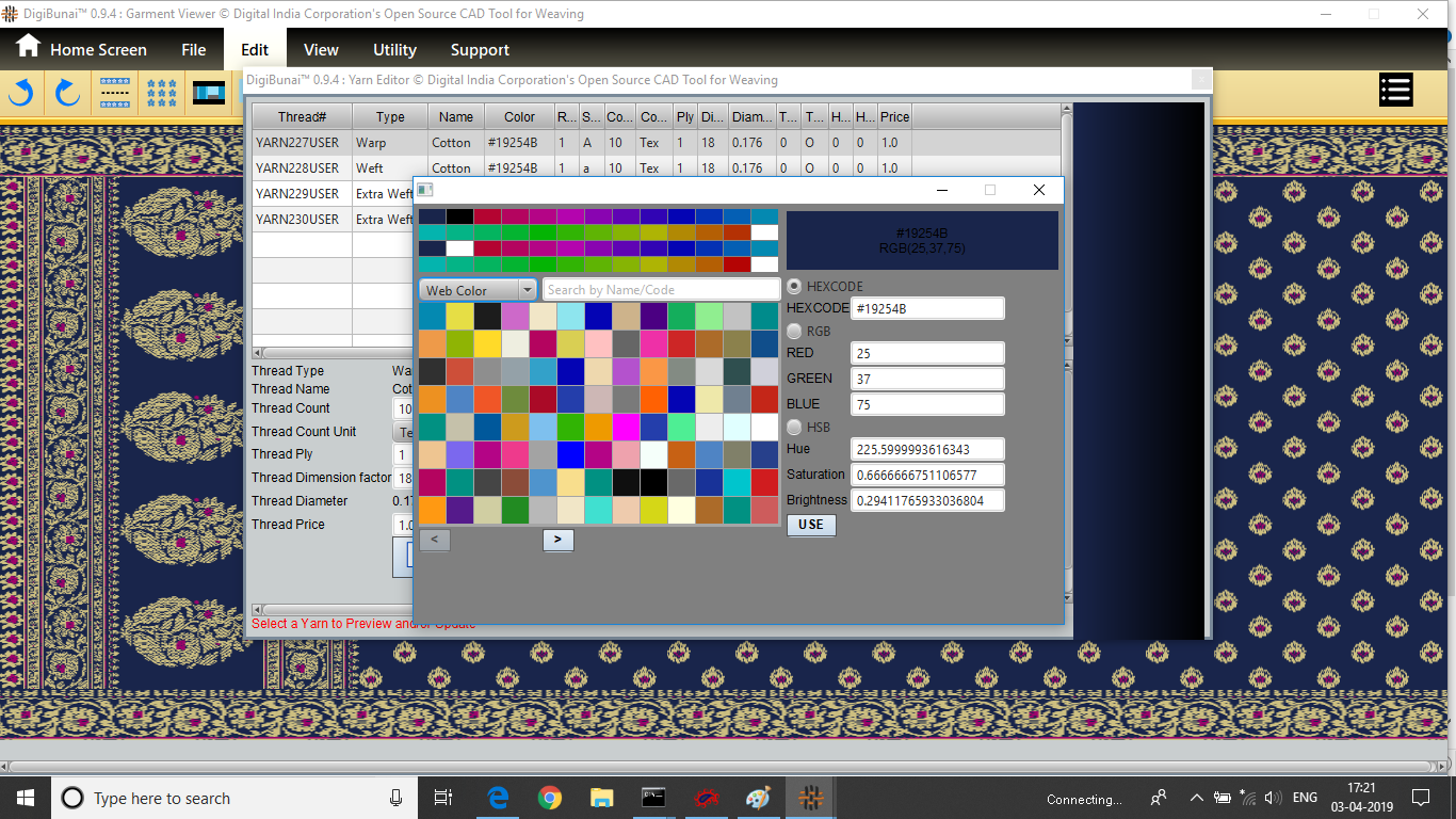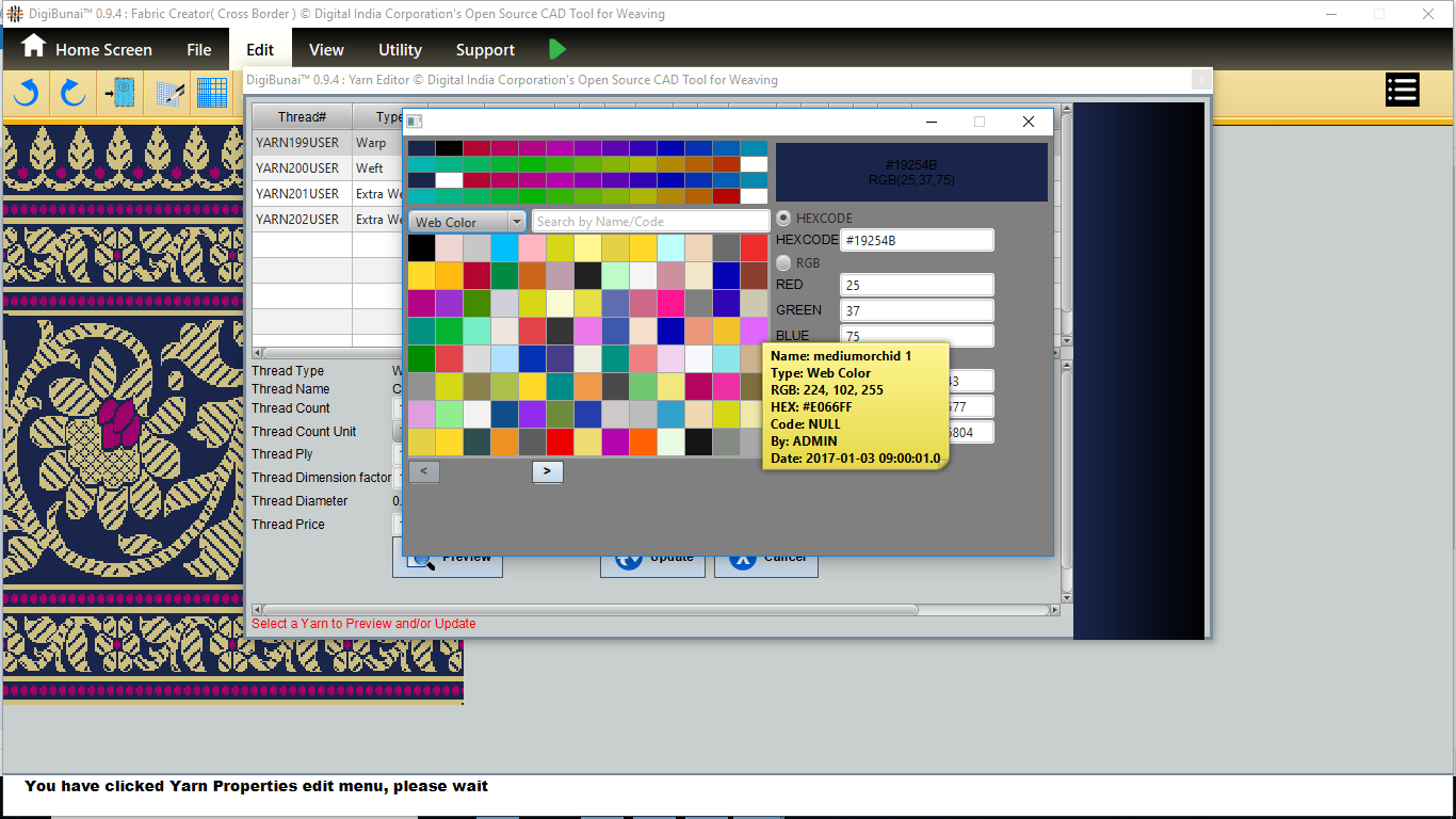 User want to set silk thread in weft portion from colour pallete by selecting thread name in fabric configuration.