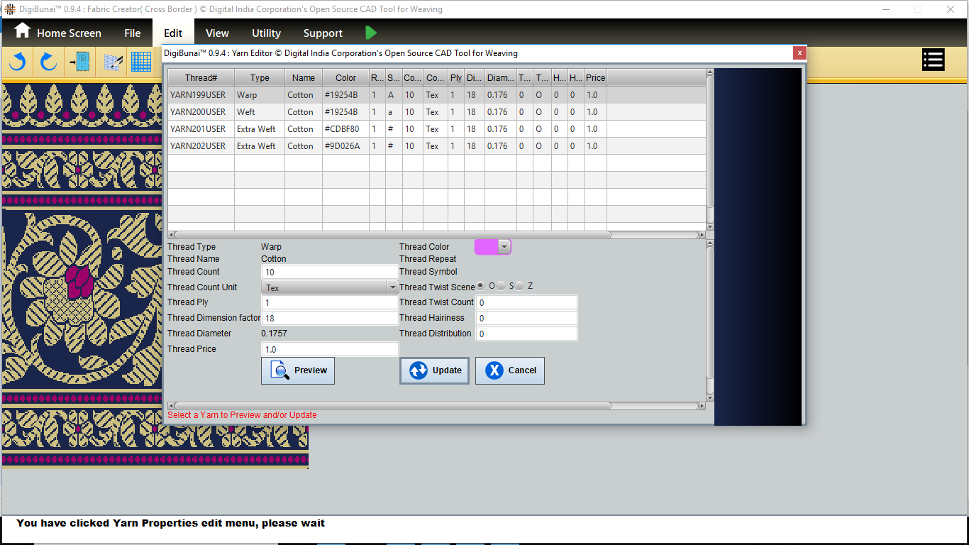User wants to change colors of fabric by clicking yarn properties button and selecting yarn and apply update button in edit menu under Fabric Creator.