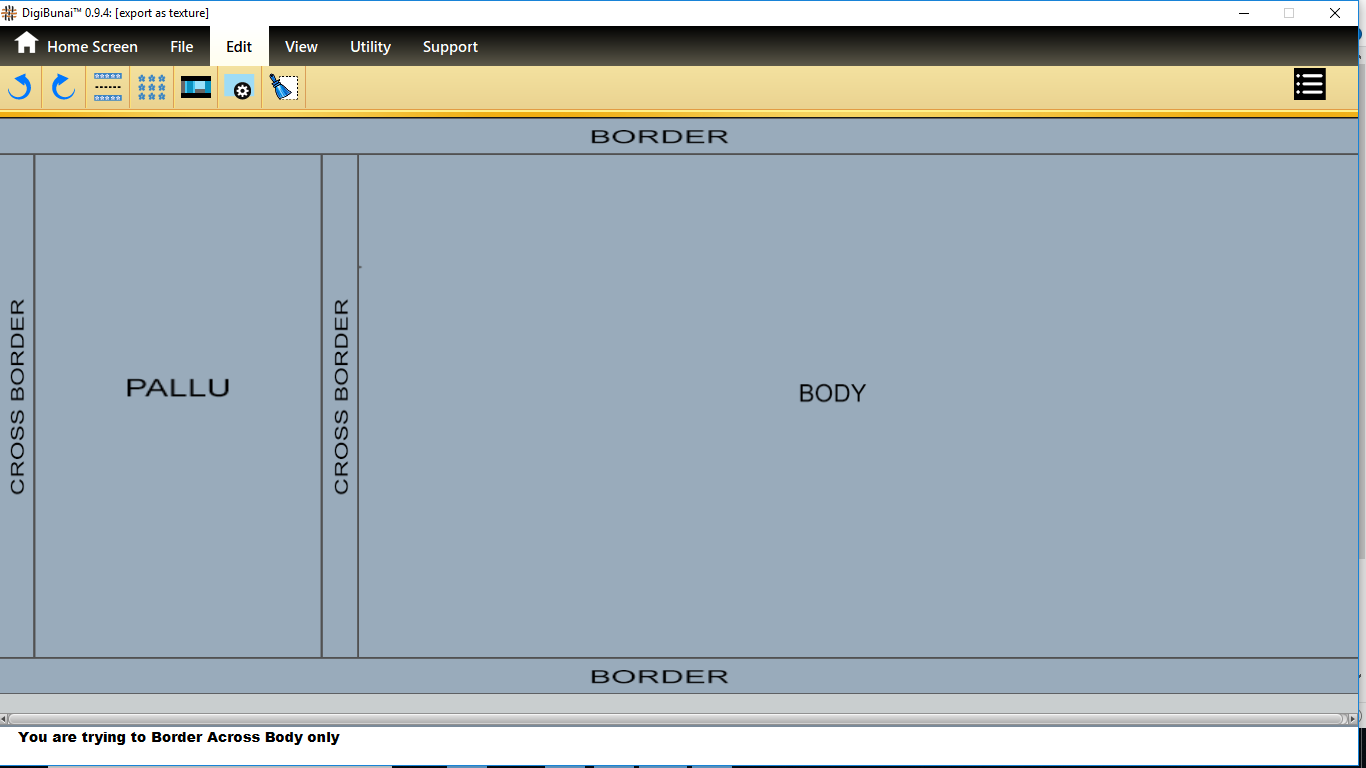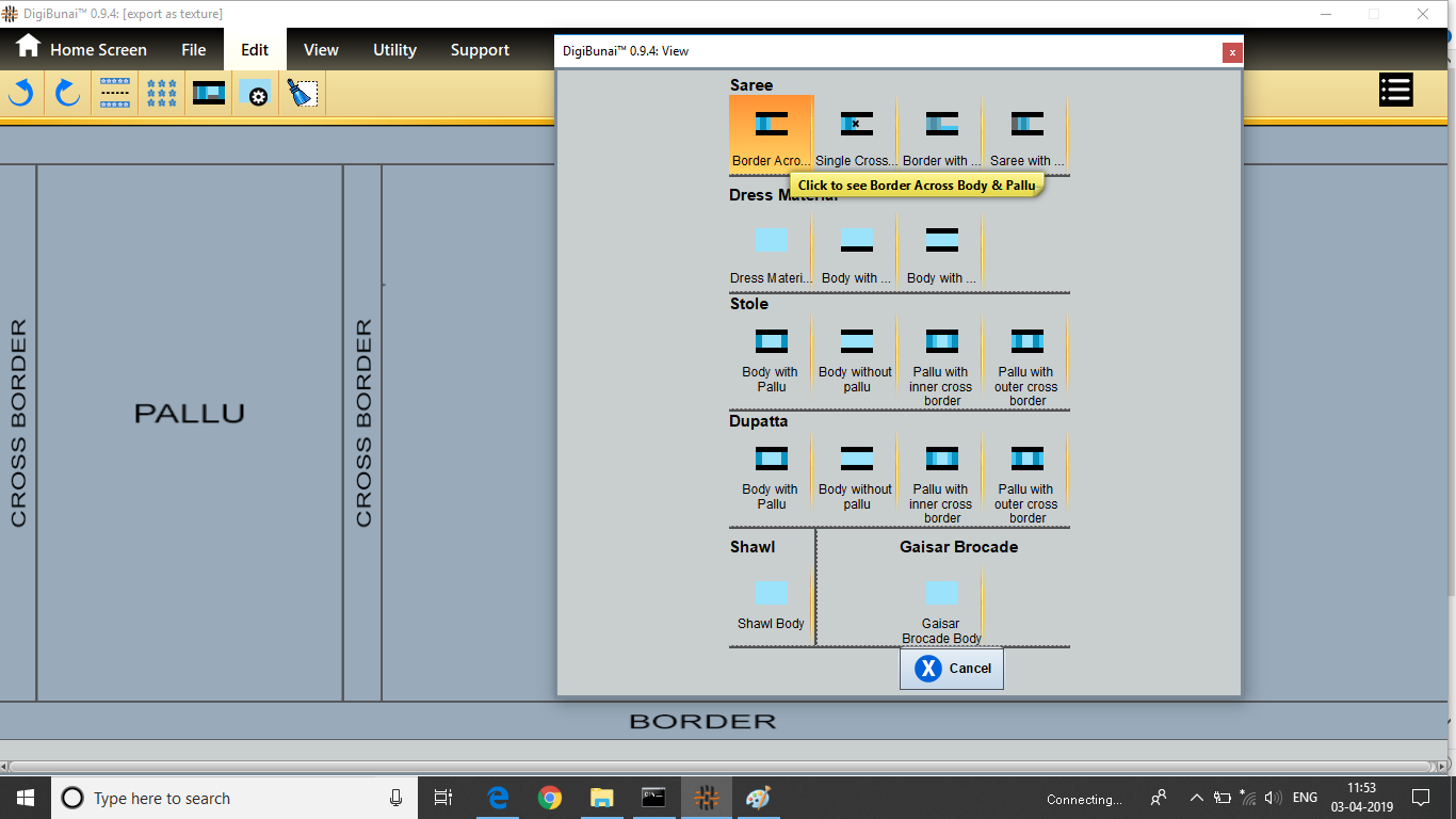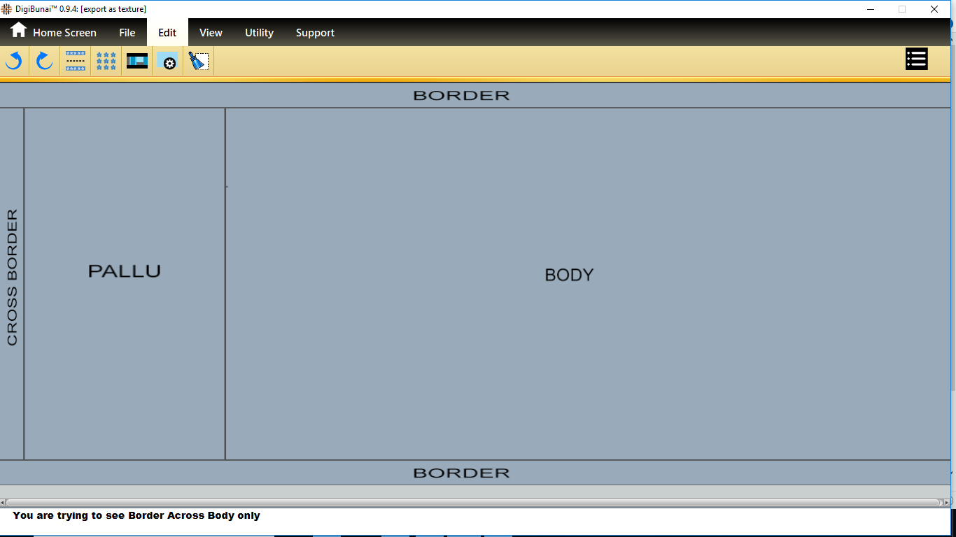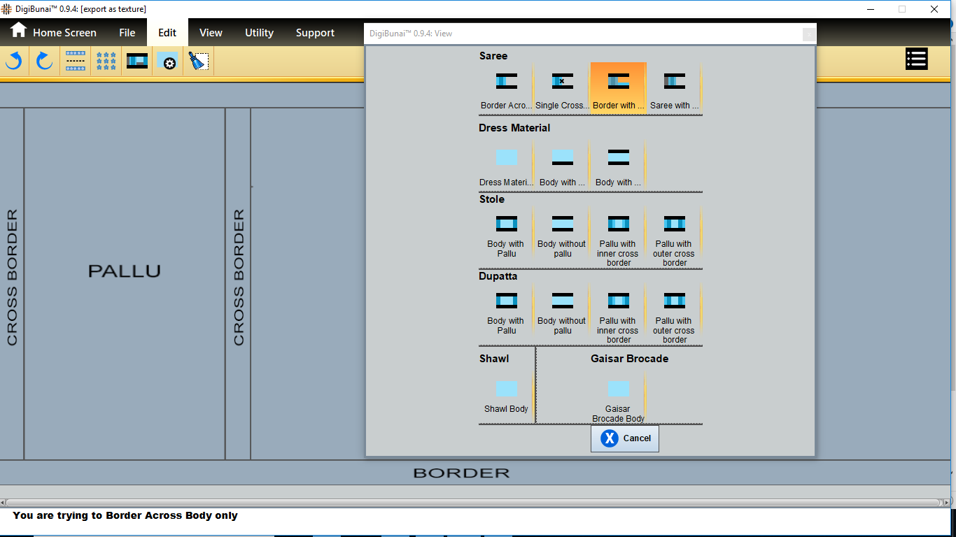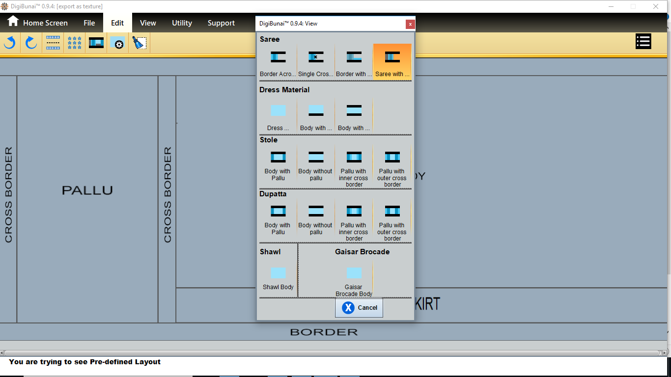User wants to see border across body and pallu by selecting Border across body and pallu in predefined layout of edit menu under Garment Viewer.