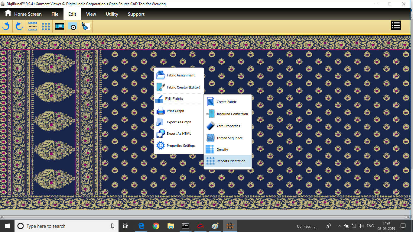 User wants to change and see fabric size, rotation and repeat mode in saree layout by clicking mouse right and select fabric orientation in saree layout under Garment Viewer.