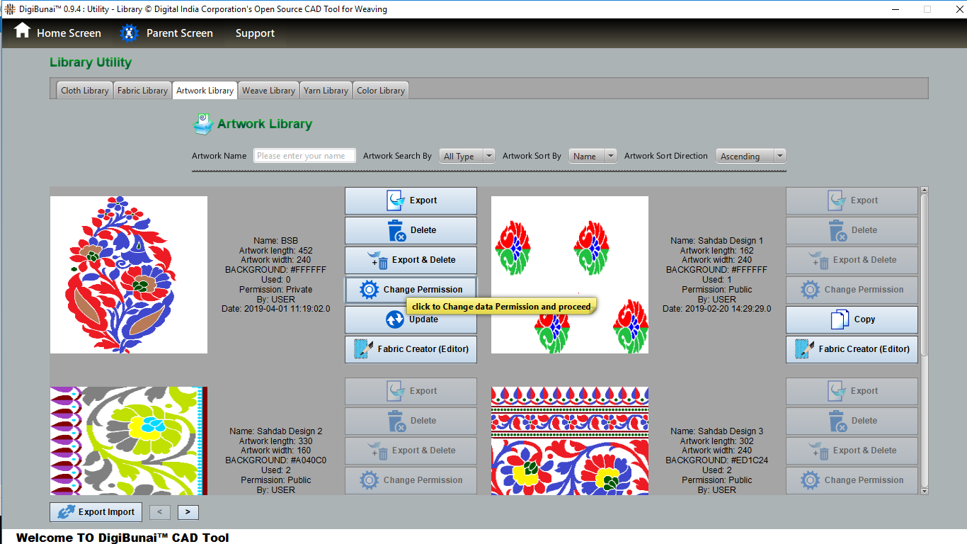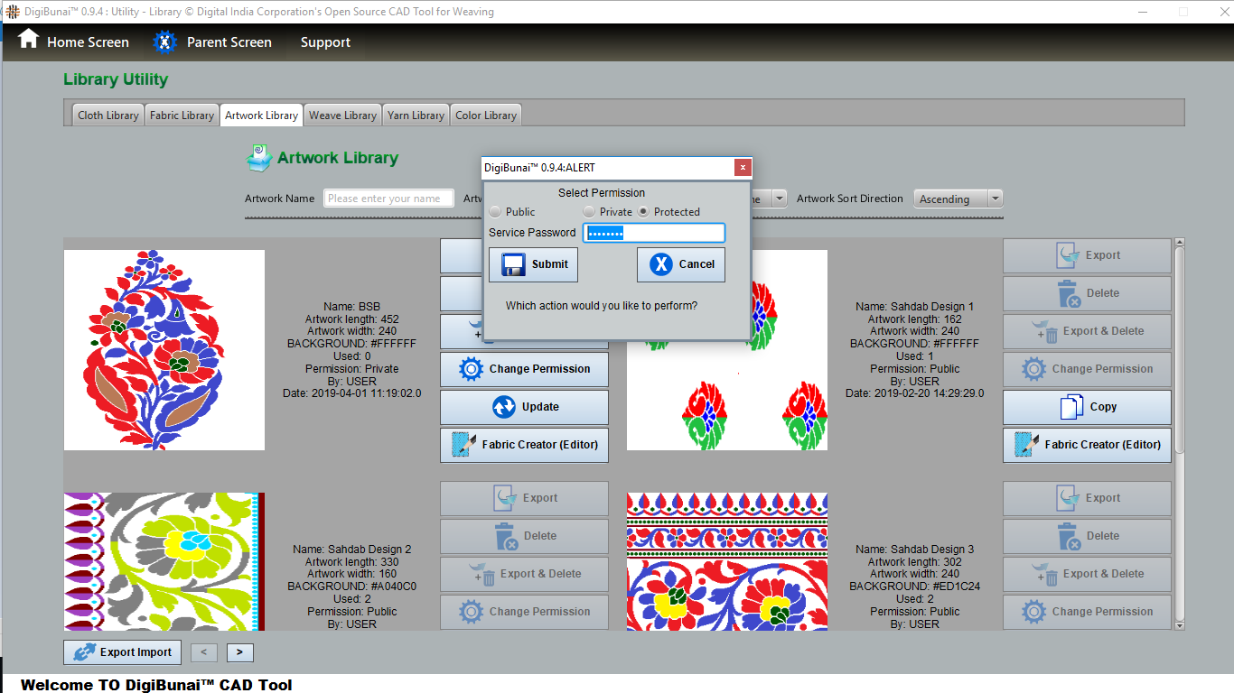 User wants to change permission (artwork, fabric, weave) by clicking permission button and selecting (public, private and protected with password and apply OK button) in artwork library under utility module.
