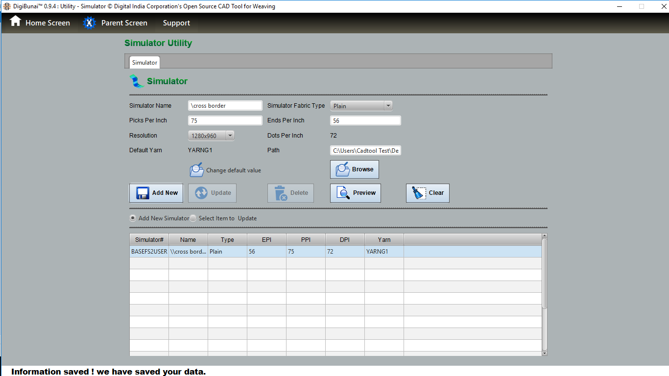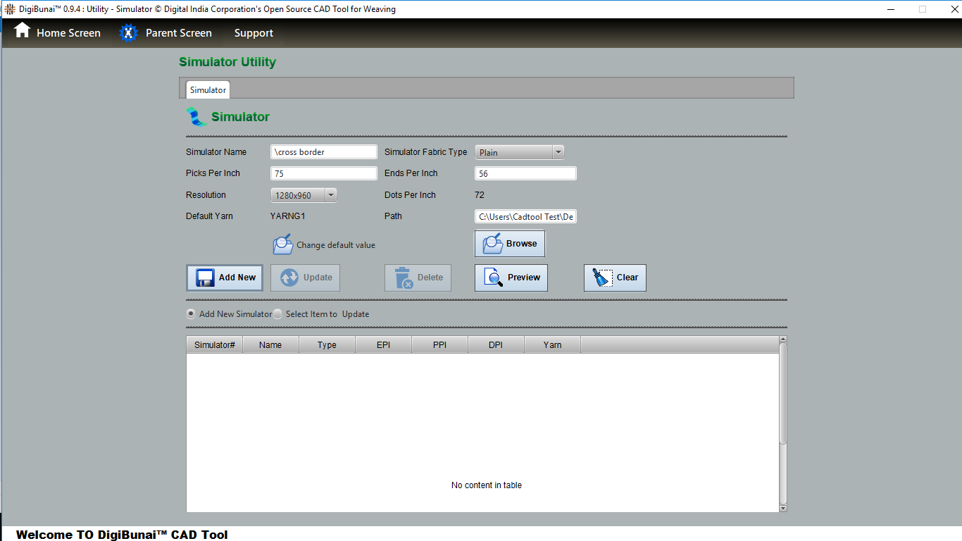 User can wants to see simulation view by adding different yarn with simulator (setting simulator path and name) in utility under utility module.