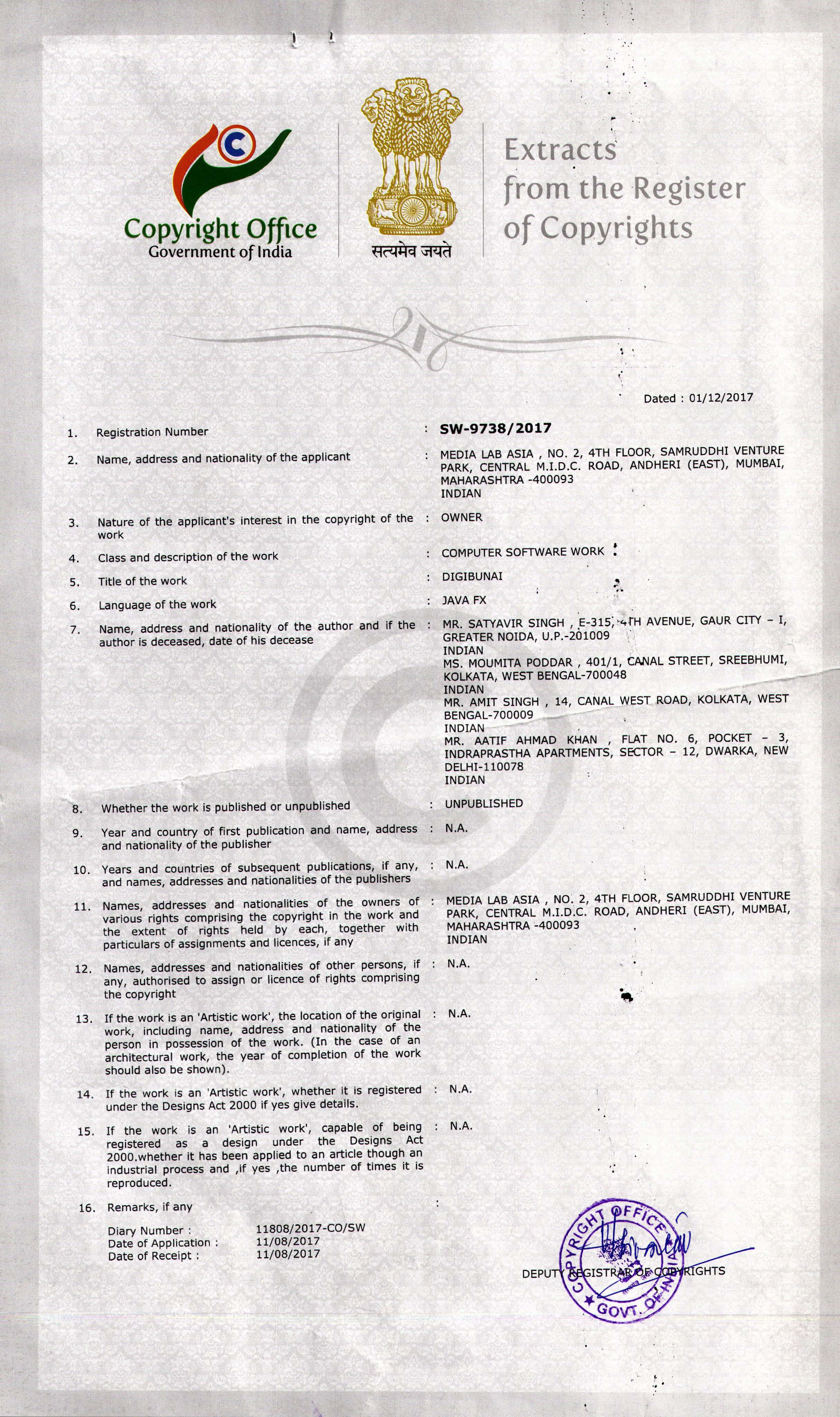 DigiBunaiTM is an open-source software and is licenced wih GPLv3. The source code of the software has been copyright under "Computer Software Work" by Copyright Office, Goverment of India on 01/12/2017.