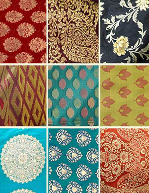 Brocade refers to those textiles wherein patterns are created in weaving by transfixing or thrusting the pattern-thread between the warp. In regular weaving the weft thread passes over and under the warp thread regularly. But when brocade designs in gold, silver silk or cotton threads are to be woven, special threads are transfixed in between by skipping the passage of the regular weft over a certain number of warp threads (depending upon the pattern) and by regularizing the skipping by means of pre-arranged heddles for each type of patterning